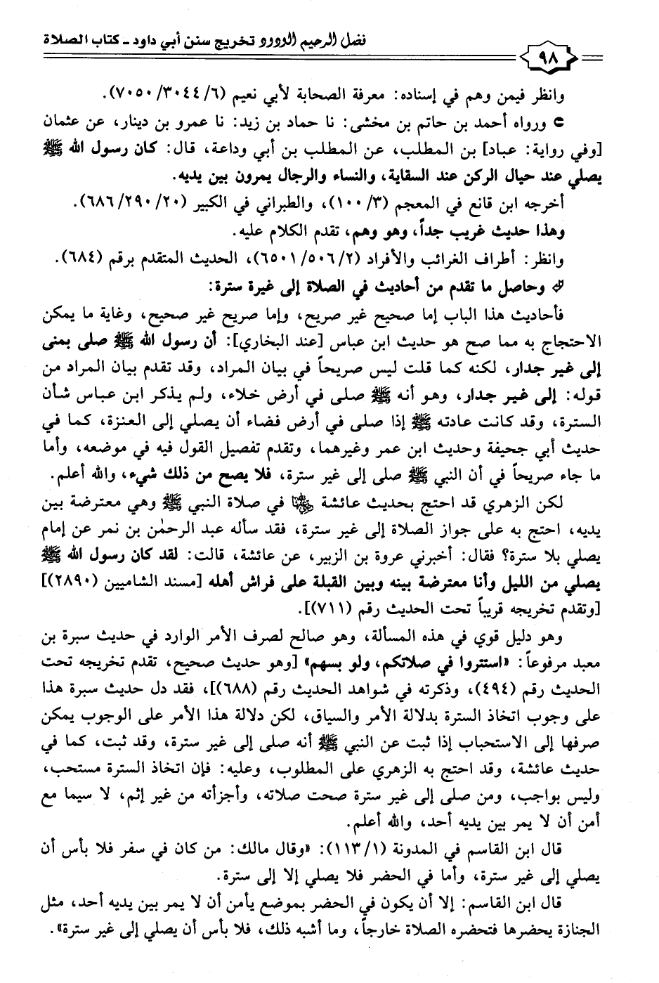 وهو دليل قوي في هذه المسألة، وهو صالح لصرف الأمر الوارد في حديث سبرة بن معبد مرفوعًا: "استتروا في صلاتكم، ولو بسهم" [وهو حديث صحيح، تقدم تخريجه تحت الحديث رقم (٤٩٤)، وذكرته في شواهد الحديث رقم (٦٨٨)]، فقد دل حديث سبرة هذا على وجوب اتخاذ السترة بدلالة الأمر والسياق، لكن دلالة هذا الأمر على الوجوب يمكن صرفها إلى الاستحباب إذا ثبت عن النبي - صلى الله عليه وسلم - أنه صلى إلى غير سترة، وقد ثبت، كما في حديث عائشة، وقد احتج به الزهري على المطلوب، وعليه: فإن اتخاذ السترة مستحب، وليس بواجب، ومن صلى إلى غير سترة صحت صلاته، وأجزأته من غير إثم، لا سيما مع أمن أن لا يمر بين يديه أحد، والله أعلم.