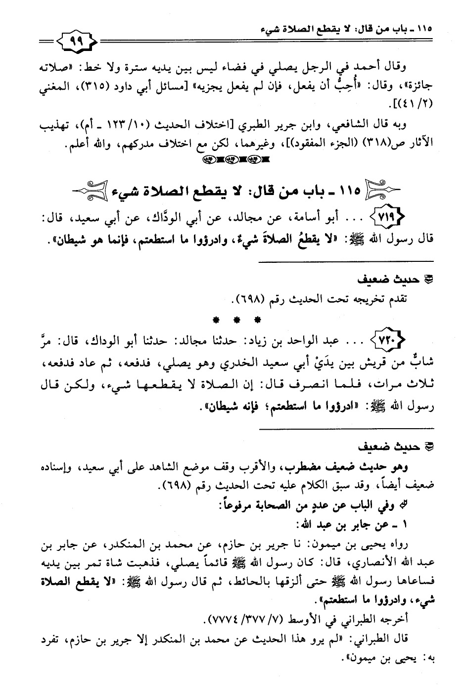 ٧١٩ - . . . أبو أسامة، عن مجالد، عن أبي الودَّاك، عن أبي سعيد، قال: قال رسول الله - صلى الله عليه وسلم -: "لا يقطعُ الصلاةَ شيءٌ"، وادرؤوا ما استطعتم، فإنما هو شيطان".