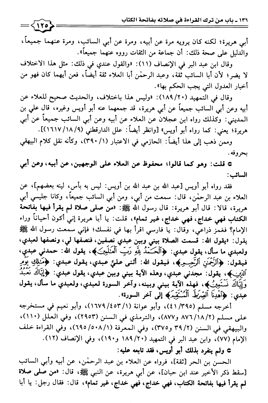 فقد رواه أبو أويس [عبد الله بن عبد الله بن أويس: ليس به بأس، لينه بعضهم]، عن العلاء بن عبد الرحمن، قال: سمعت من أبي، ومن أبي السائب جميعًا، وكانا جليسي أبي هريرة، قالا: قال أبو هريرة: قال رسول الله - صلى الله عليه وسلم -: "من صلى صلاة لم يقرأ فيها بفاتحة الكتاب فهي خداج، فهي خداج، غير تمام"، قلت: يا أبا هريرة إني أكون أحيانًا وراء الإمام؟ فغمز ذراعي، وقال: يا فارسي اقرأ بها في نفسك؛ فإني سمعت رسول الله - صلى الله عليه وسلم - يقول: "يقول الله: قسمت الصلاة بيني وبين عبدي نصفين، فنصفها لي، ونصفها لعبدي، ولعبدي ما سأل، يقول عبدي: {الْحَمْدُ لِلَّهِ رَبِّ الْعَالَمِينَ}، يقول الله: حمدني عبدِي، فيقول: {الرَّحْمَنِ الرَّحِيمِ}، فيقول الله: أثنى علي عبدي، يقول عبدي: {مَالِكِ يَوْمِ الدِّينِ}، يقول: مجدني عبدي، وهذه الآية بيني وبين عبدي، يقول عبدي: {إِيَّاكَ نَعْبُدُ وَإِيَّاكَ نَسْتَعِينُ}، فهذه الآية بيني وبينه، وآخر السورة لعبدي، ولعبدي ما سأل، يقول عبدي: {هْدِنَا الصِّرَاطَ الْمُسْتَقِيمَ} إلى آخر السورة".