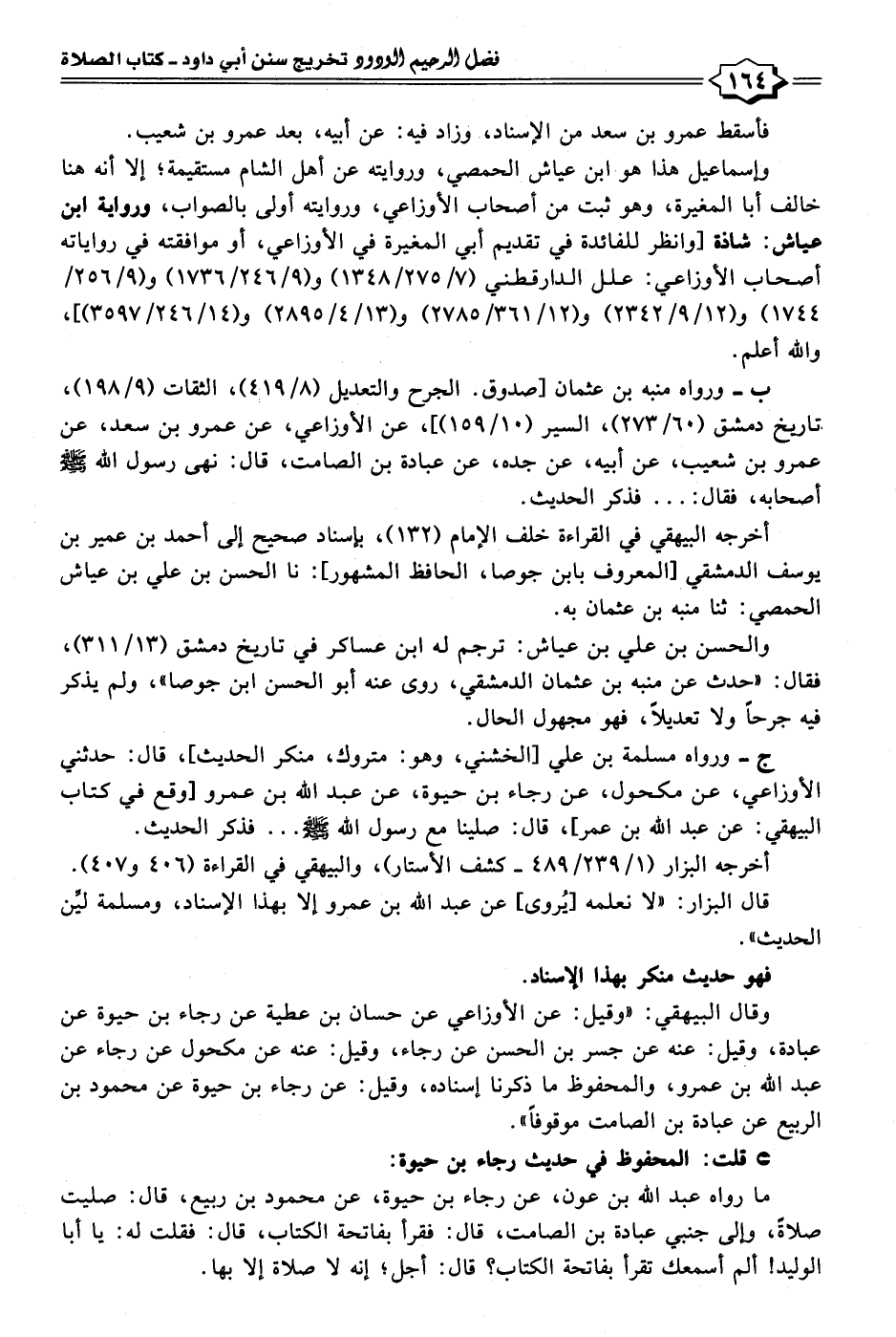 ج - ورواه مسلمة بن علي [الخشني، وهو: متروك، منكر الحديث]، قال: حدثني الأوزاعي، عن مكحول، عن رجاء بن حيوة، عن عبد الله بن عمرو [وقع في كتاب البيهقي: عن عبد الله بن عمر]، قال: صلينا مع رسول الله - صلى الله عليه وسلم - . . . فذكر الحديث.