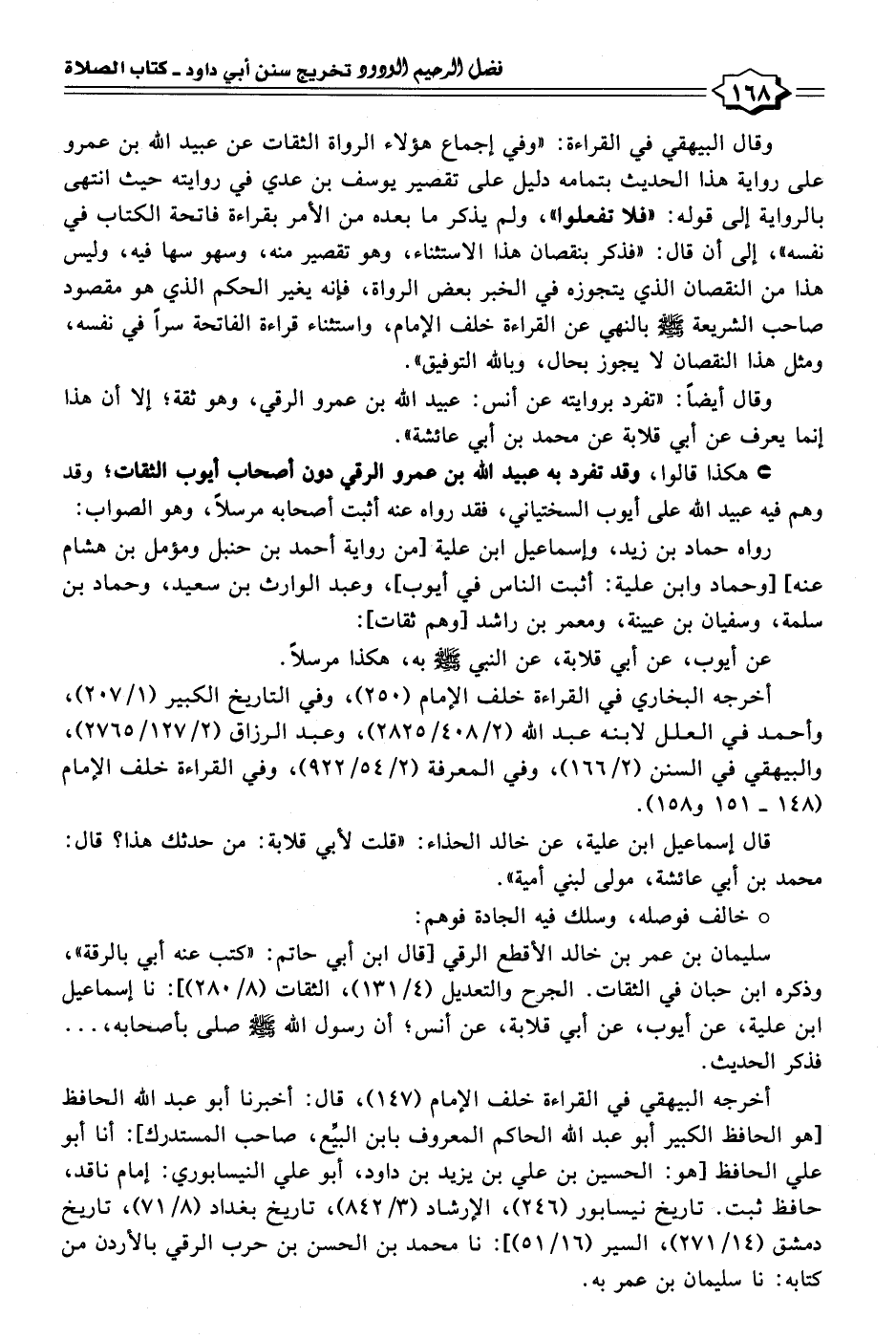 وقال البيهقي في القراءة: "وفي إجماع هؤلاء الرواة الثقات عن عبيد الله بن عمرو على رواية هذا الحديث بتمامه دليل على تقصير يوسف بن عدي في روايته حيث انتهى بالرواية إلى قوله: "فلا تفعلوا"، ولم يذكر ما بعده من الأمر بقراءة فاتحة الكتاب في نفسه"، إلى أن قال: "فذكر بنقصان هذا الاستثناء، وهو تقصير منه، وسهو سها فيه، وليس هذا من النقصان الَّذي يتجوزه في الخبر بعض الرواة، فإنه يغير الحكم الَّذي هو مقصود صاحب الشريعة - صلى الله عليه وسلم - بالنهي عن القراءة خلف الإمام، واستثناء قراءة الفاتحة سرًّا في نفسه، ومثل هذا النقصان لا يجوز بحال، وبالله التوفيق".