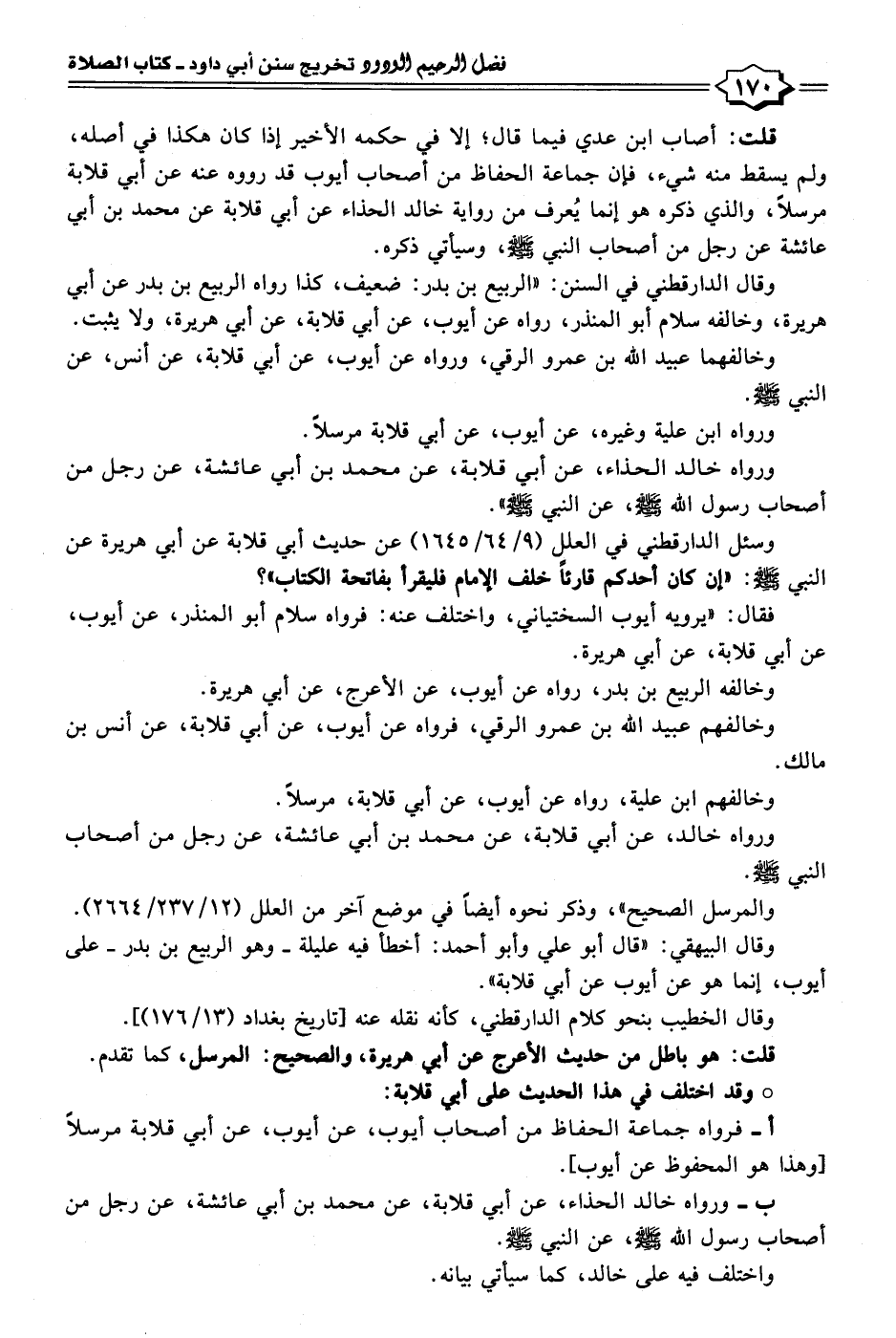 وسئل الدارقطني في العلل (٩/ ٦٤/ ١٦٤٥) عن حديث أبي قلابة عن أبي هريرة عن النبي - صلى الله عليه وسلم -: "إن كان أحدكم قارئًا خلف الإمام فليقرأ بفاتحة الكتاب"؟