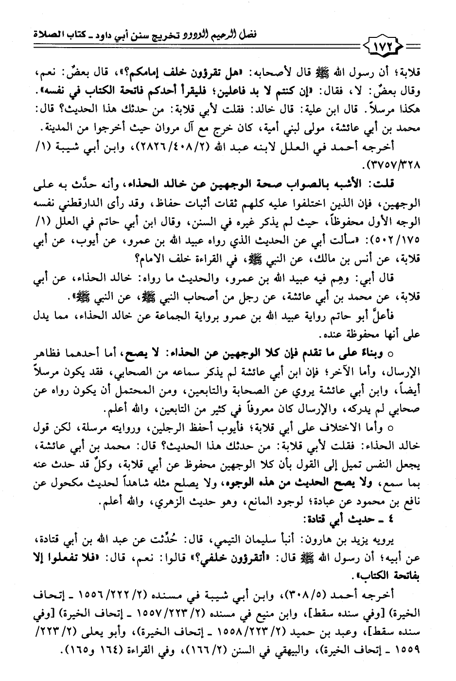 قلت: الأشبه بالصواب صحة الوجهين عن خالد الحذاء، وأنه حدَّث به على الوجهين، فإن الذين اختلفوا عليه كلهم ثقات أثبات حفاظ، وقد رأى الدارقطني نفسه الوجه الأول محفوظًا، حيث لم يذكر غيره في السنن، وقال ابن أبي حاتم في العلل (١/ ١٧٥/ ٥٠٢): "سألت أبي عن الحديث الَّذي رواه عبيد الله بن عمرو، عن أيوب، عن أبي قلابة، عن أَنس بن مالك، عن النبي - صلى الله عليه وسلم -، في القراءة خلف الإمام؟