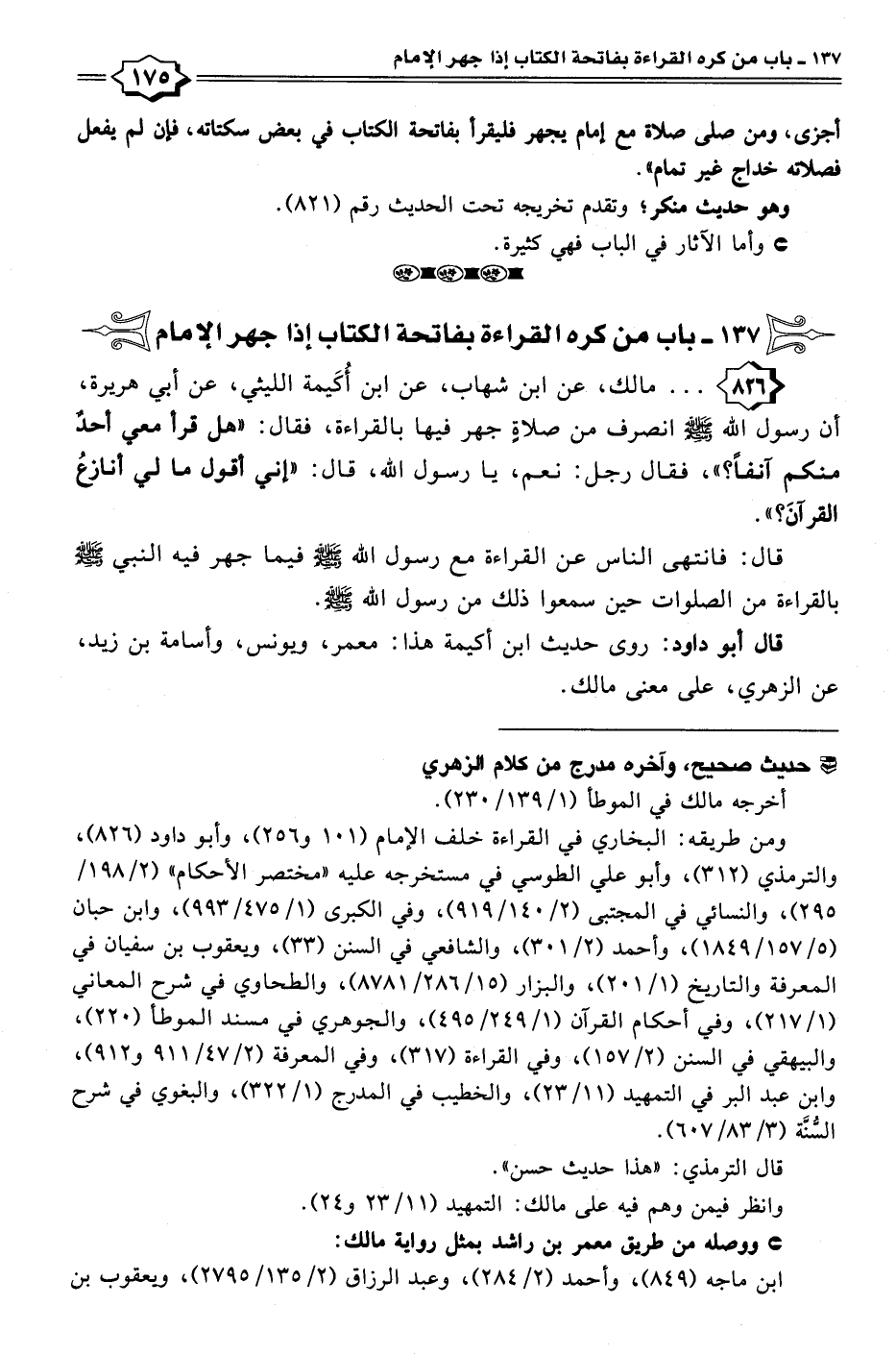 ومن طريقه: البخاري في القراءة خلف الإمام (١٠١ و ٢٥٦)، وأبو داود (٨٢٦)، والترمذي (٣١٢)، وأبو علي الطوسي في مستخرجه عليه "مختصر الأحكام" (٢/ ١٩٨/ ٢٩٥)، والنسائي في المجتبى (٢/ ١٤٠ / ٩١٩)، وفي الكبرى (١/ ٤٧٥ / ٩٩٣)، وابن حبان (٥/ ١٥٧/ ١٨٤٩)، وأحمد (٢/ ٣٠١)، والشافعي في السنن (٣٣)، ويعقوب بن سفيان في المعرفة والتاريخ (١/ ٢٠١)، والبزار (١٥/ ٢٨٦/ ٨٧٨١)، والطحاوي في شرح المعاني (١/ ٢١٧)، وفي أحكام القرآن (١/ ٢٤٩/ ٤٩٥)، والجوهري في مسند الموطأ (٢٢٠)، والبيهقي في السنن (٢/ ١٥٧)، وفي القراءة (٣١٧)، وفي المعرفة (٢/ ٤٧/ ٩١١ و ٩١٢)، وابن عبد البر في التمهيد (١١/ ٢٣)، والخطيب في المدرج (١/ ٣٢٢)، والبغوي في شرح السُّنَّة (٣/ ٨٣/ ٦٠٧).