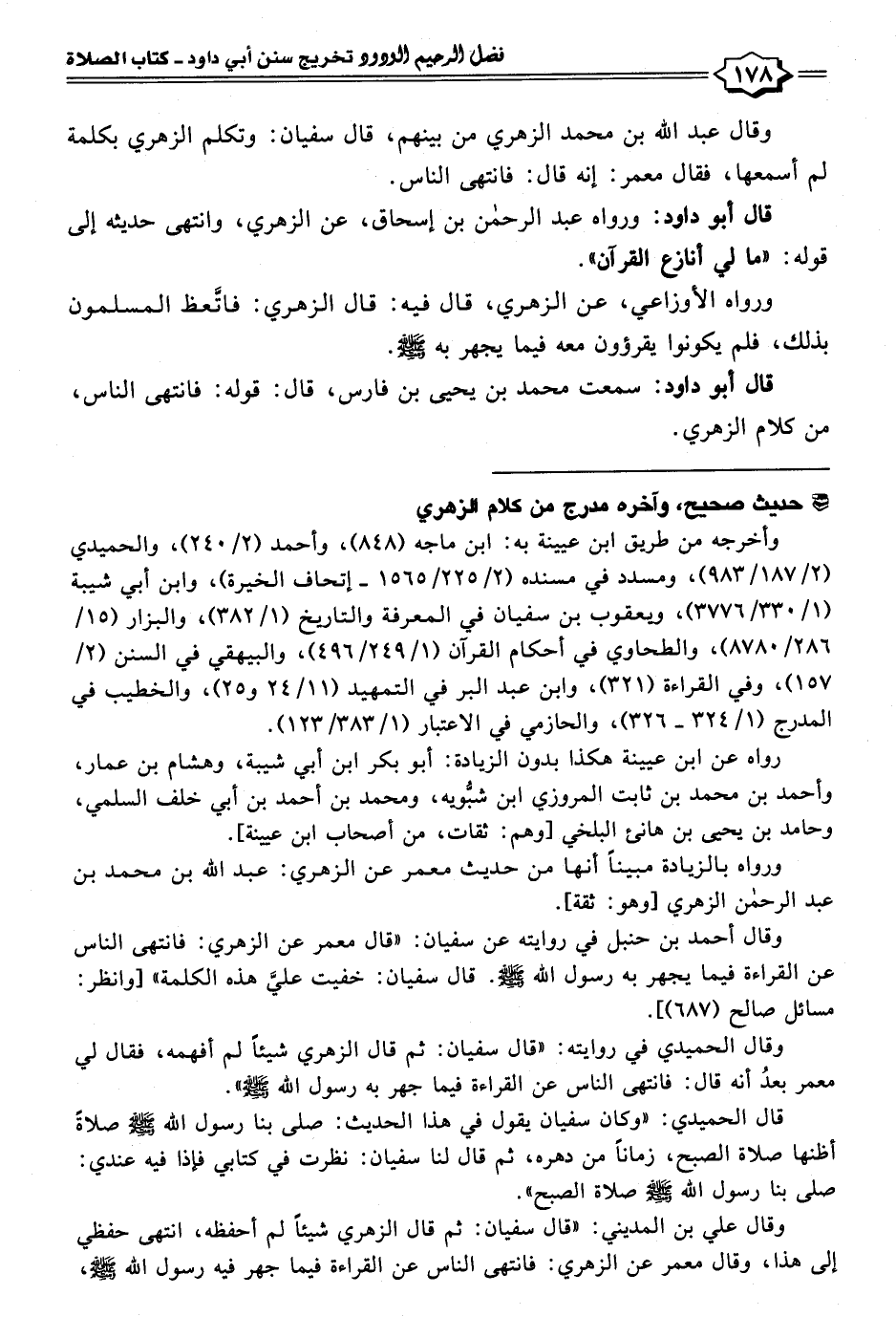 وقال علي بن المديني: "قال سفيان: ثم قال الزهري شيئًا لم أحفظه، انتهى حفظي إلى هذا، وقال معمر عن الزهري: فانتهى الناس عن القراءة فيما جهر فيه رسول الله - صلى الله عليه وسلم -،