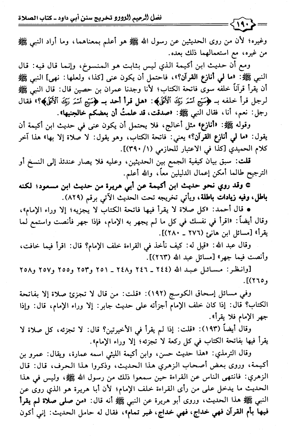 وقال الترمذي: [هذا حديث حسن، وابن أكيمة الليثي اسمه عمارة، ويقال: عمرو بن أكيمة، وروى بعض أصحاب الزهري هذا الحديث، وذكروا هذا الحرف، قال: قال الزهري: فانتهى الناس عن القراءة حين سمعوا ذلك من رسول الله - صلى الله عليه وسلم -، وليس في هذا الحديث ما يدخل على من رأى القراءة خلف الإمام؛ لأنَّ أبا هريرة هو الَّذي روى عن النبي - صلى الله عليه وسلم - هذا الحديث، وروى أبو هريرة عن النبي - صلى الله عليه وسلم - أنَّه قال: "من صلى صلاة لم يقرأ فيها بأُم القرآن فهي خداج، فهي خداج، غير تمام"، فقال له حامل الحديث: إني أكون