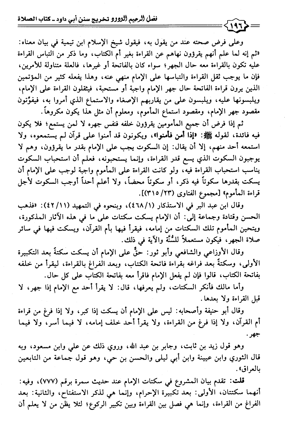 وقال ابن عبد البر في الاستذكار (١/ ٤٦٨)، وبنحوه في التمهيد (١١/ ٤٢): "فذهب الحسن وقتادة وجماعة إلى: أن الإمام يسكت سكتات على ما لي هذه الآثار المذكورة، ويتحين المأموم تلك السكتات من إمامه، فيقرأ فيها بأُم القرآن، ويسكت فيها في سائر صلاة الجهر، فيكون مستعملًا للسُّنَّة والآية في ذلك.