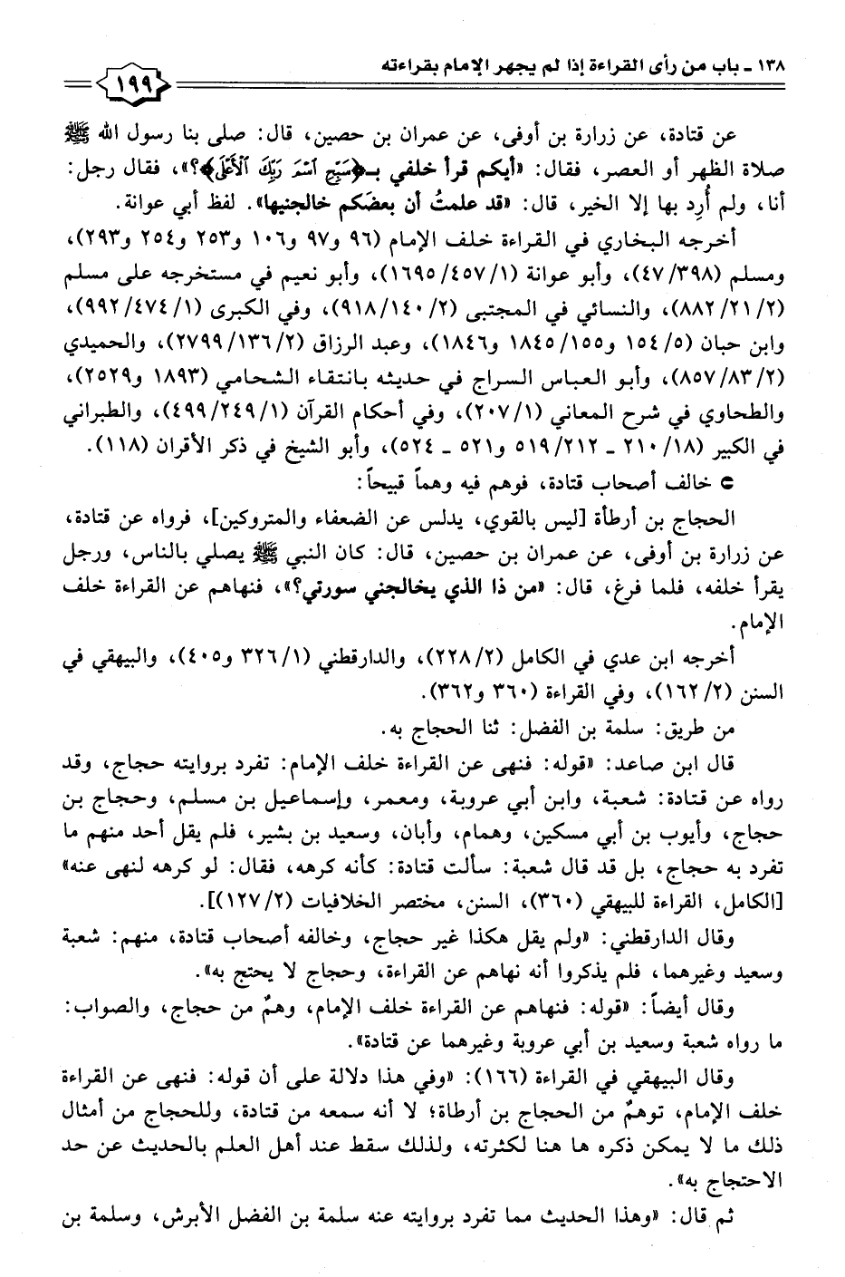 الحجاج بن أرطأة [ليس بالقوي، يدلس عن الضعفاء والمتروكين]، فرواه عن قتادة، عن زرارة بن أوفى، عن عمران بن حصين، قال: كان النبي - صلى الله عليه وسلم - يصلي بالناس، ورجل يقرأ خلفه، فلما فرغ، قال: "من ذا الَّذي يخالجني سورتي؟ "، فنهاهم عن القراءة خلف الإمام.
