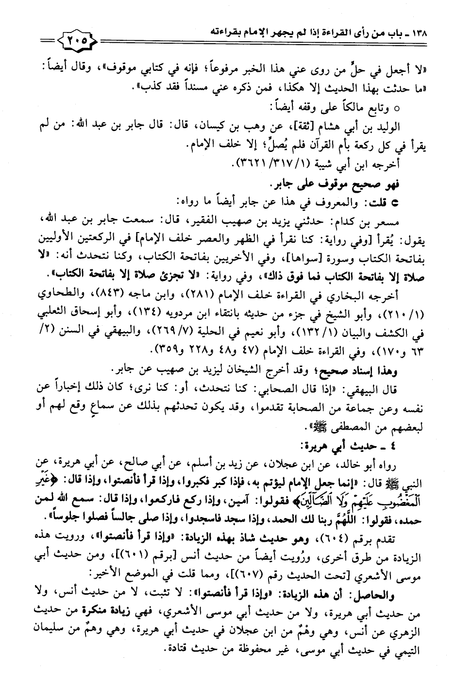 مسعر بن كدام: حدثني يزيد بن صهيب الفقير، قال: سمعت جابر بن عبد الله، يقول: يُقرأ [وفي رواية: كنا نقرأ في الظهر والعصر خلف الإمام] في الركعتين الأوليين بفاتحة الكتاب وسورة [سواها]، وفي الأخريين بفاتحة الكتاب، وكنا نتحدث أنَّه: إلا صلاة إلا بفاتحة الكتاب فما فوق ذاك"، وفي رواية: "لا تجزئ صلاة إلا بفاتحة الكتاب".