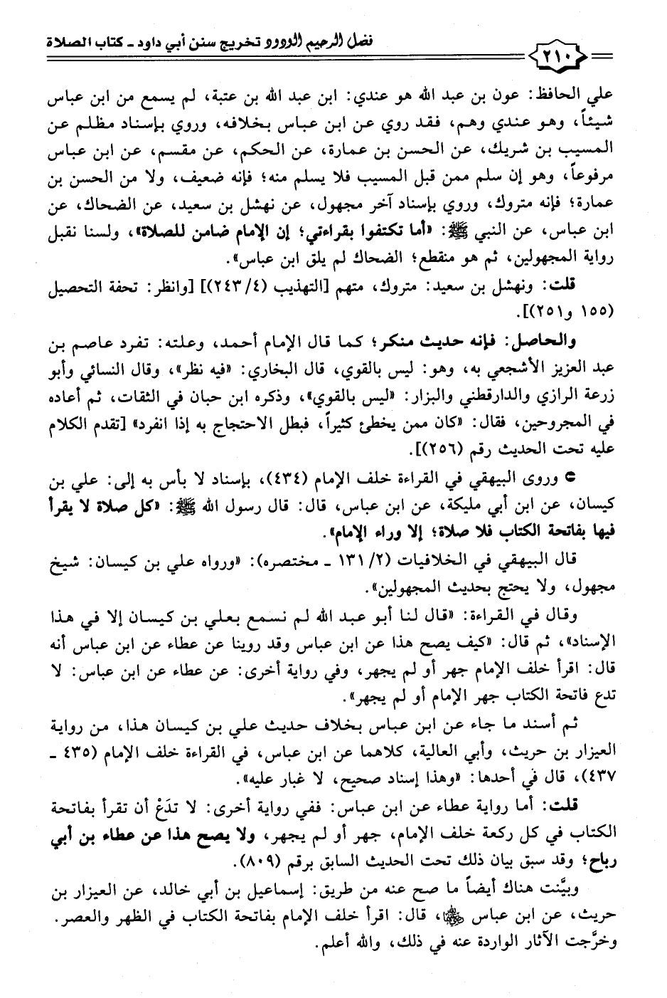 ثم أسند ما جاء عن ابن عباس بخلاف حديث علي بن كيسان هذا، من رواية العيزار بن حريث، وأبي العالية، كلاهما عن ابن عباس، في القراءة خلف الإمام (٤٣٥ - ٤٣٧)، قال في أحدها: "وهذا إسناد صحيح، لا غبار عليه".