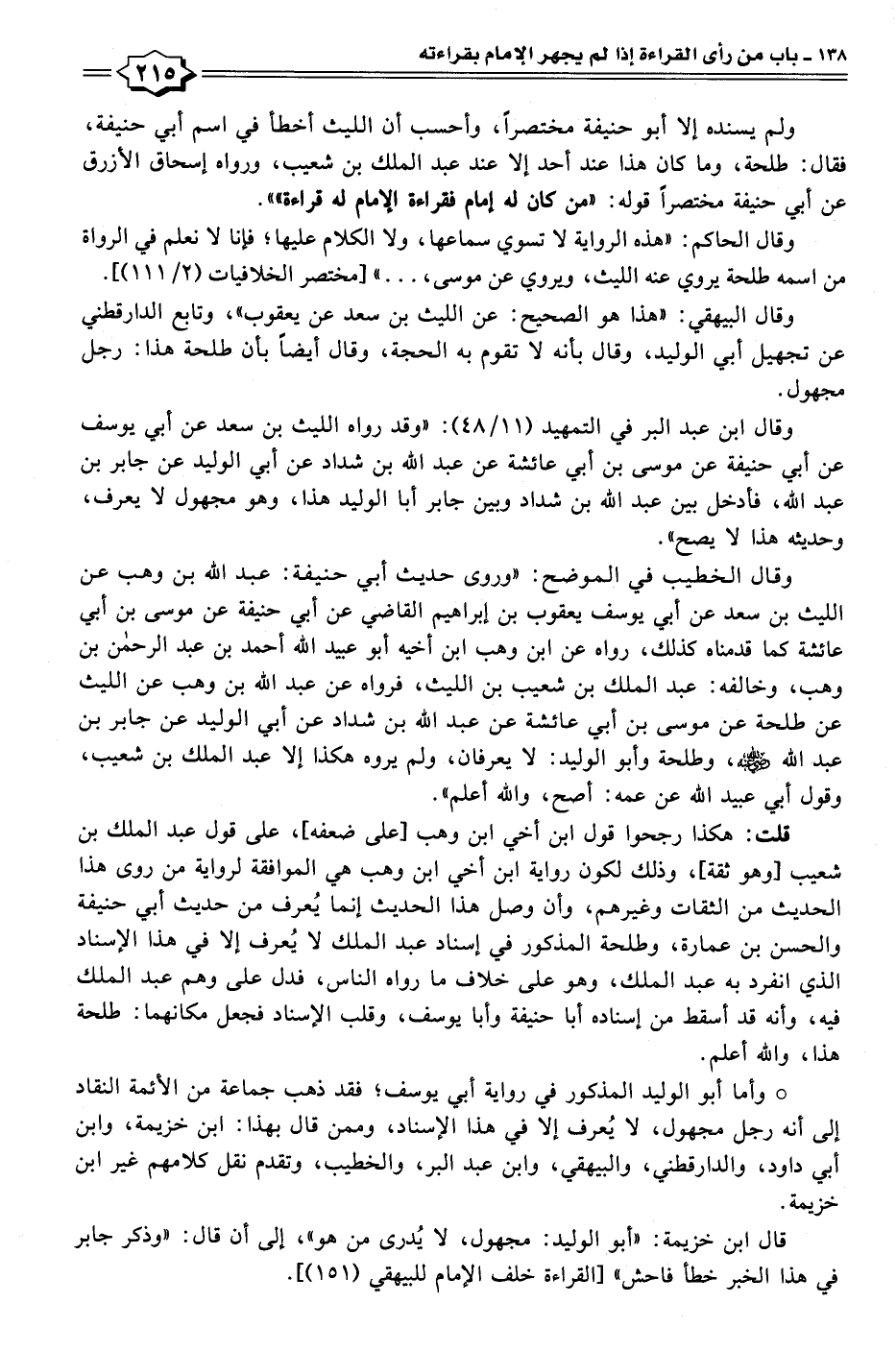 وقال البيهقي: "هذا هو الصحيح: عن الليث بن سعد عن يعقوب"، وتابع الدارقطني عن تجهيل أبي الوليد، وقال بأنه لا تقوم به الحجة، وقال أيضًا بأن طلحة هذا: رجل مجهول.