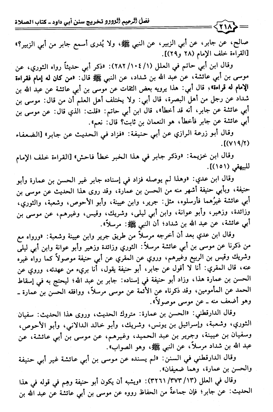 وقال ابن عدي بعد أن أخرجه مرسلًا من طريق جرير وابن عيينة وشعبة: "ورواه مع من ذكرنا عن موسى بن أبي عائشة مرسلًا: الثوري وزائدة وزهير وأبو عوانة وابن أبي ليلى وشريك وقيس بن الربيع وغيرهم، وروي عن المقري عن أبي حنيفة موصولًا كما رواه غيره عنه، قال المقري: أنا لا أقول عن جابر، أبو حنيفة يقول، أنا بريء من عهدته، وروي عن الحسن بن عمارة هذا، وزاد أبو حنيفة في إسناده: جابر بن عبد الله؛ ليحتج به في إسقاط الحمد عن المأمومين، وقد ذكرناه عن الأئمة عن موسى مرسلًا، ووافقه الحسن بن عمارة -وهو أضعف منه- عن موسى موصولًا".