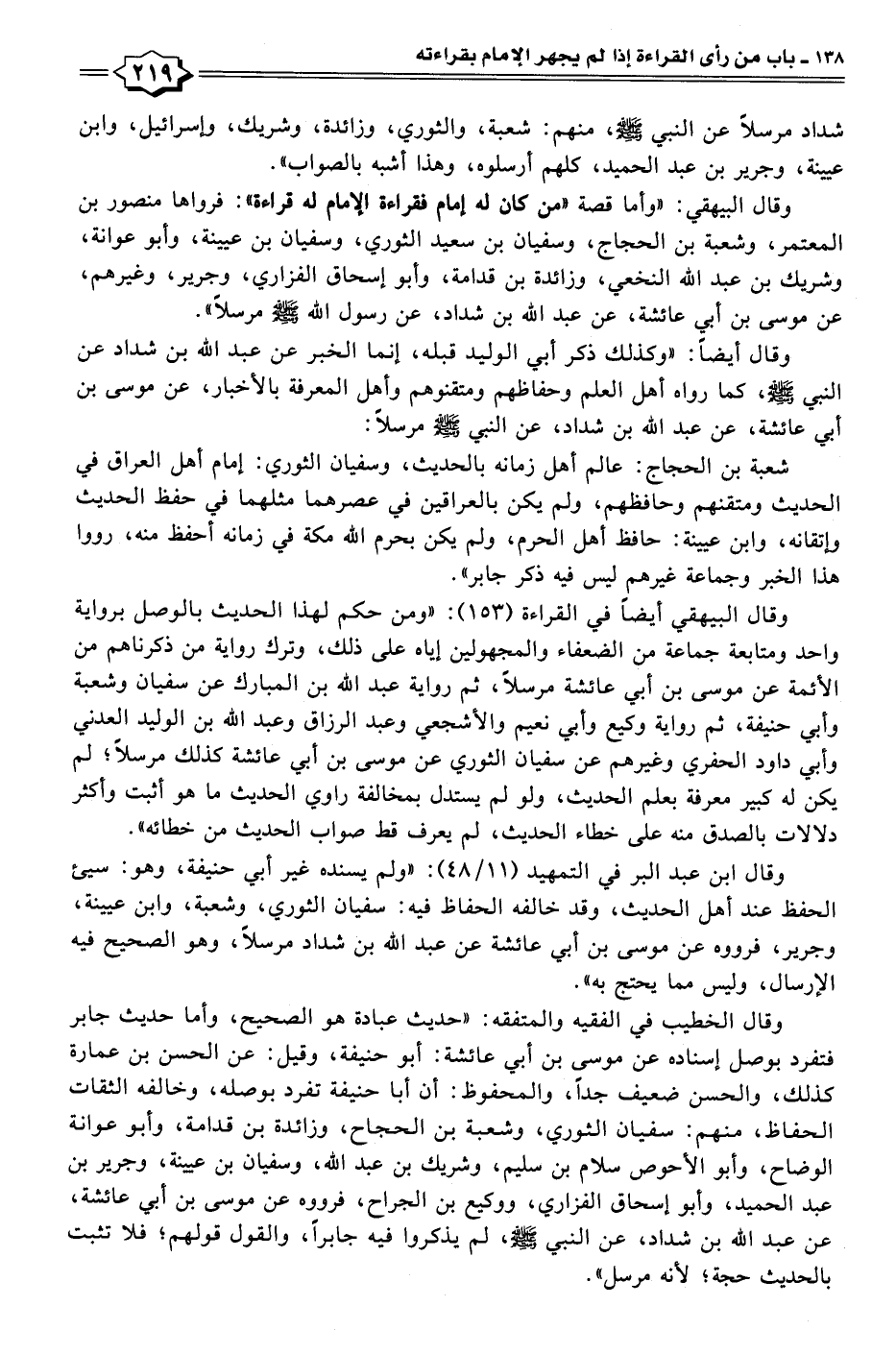 وقال البيهقي: "وأما قصة "من كان له إمام فقراءة الإمام له قراءة": فرواها منصور بن المعتمر، وشعبة بن الحجاج، وسفيان بن سعيد الثوري، وسفيان بن عيينة، وأبو عوانة، وشريك بن عبد الله النخعي، وزائدة بن قدامة، وأبو إسحاق الفزاري، وجرير، وغيرهم، عن موسى بن أبي عائشة، عن عبد الله بن شداد، عن رسول الله - صلى الله عليه وسلم - مرسلًا".