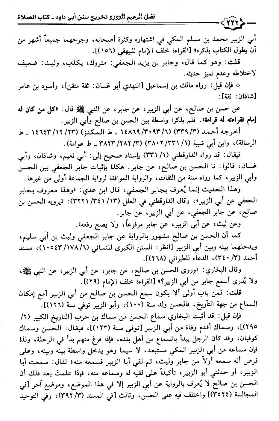 عن حسن بن صالح، عن أبي الزبير، عن جابر، عن النبي - صلى الله عليه وسلم - قال: "كل من كان له إمام فقراءته له قراءة". فلم يذكرا واسطة بين الحسن بن صالح وأبي الزبير.