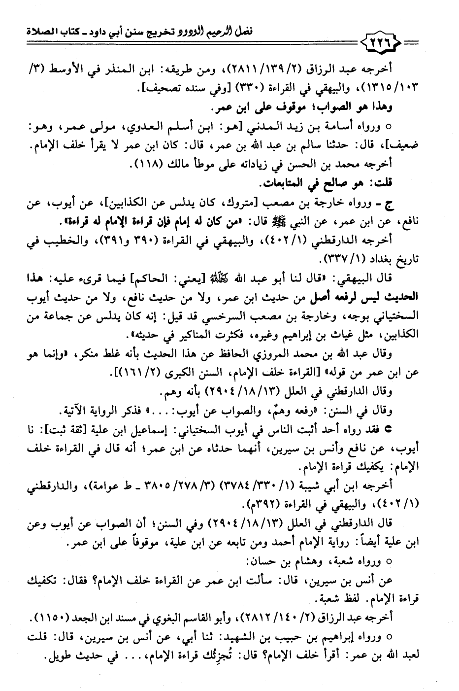 ج - ورواه خارجة بن مصعب [متروك، كان يدلس عن الكذابين]، عن أيوب، عن نافع، عن ابن عمر، عن النبي - صلى الله عليه وسلم - قال: "من كان له إمام فإن قراءة الإمام له قراءة".