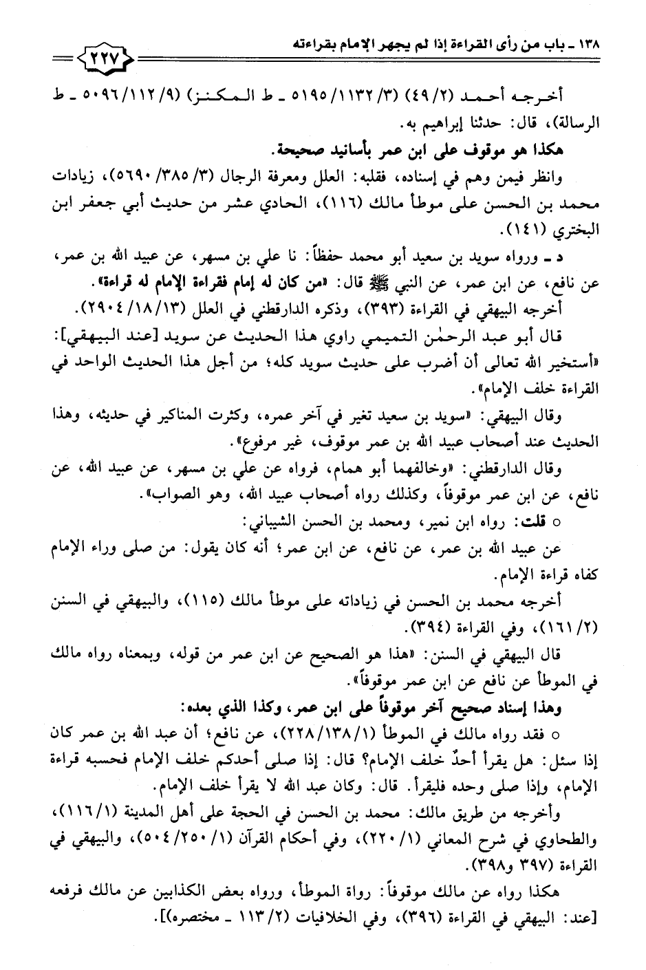 د- ورواه سويد بن سعيد أبو محمد حفظًا: نا علي بن مسهر، عن عبيد الله بن عمر، عن نافع، عن ابن عمر، عن النبي - صلى الله عليه وسلم - قال: "من كان له إمام فقراءة الإمام له قراءة".
