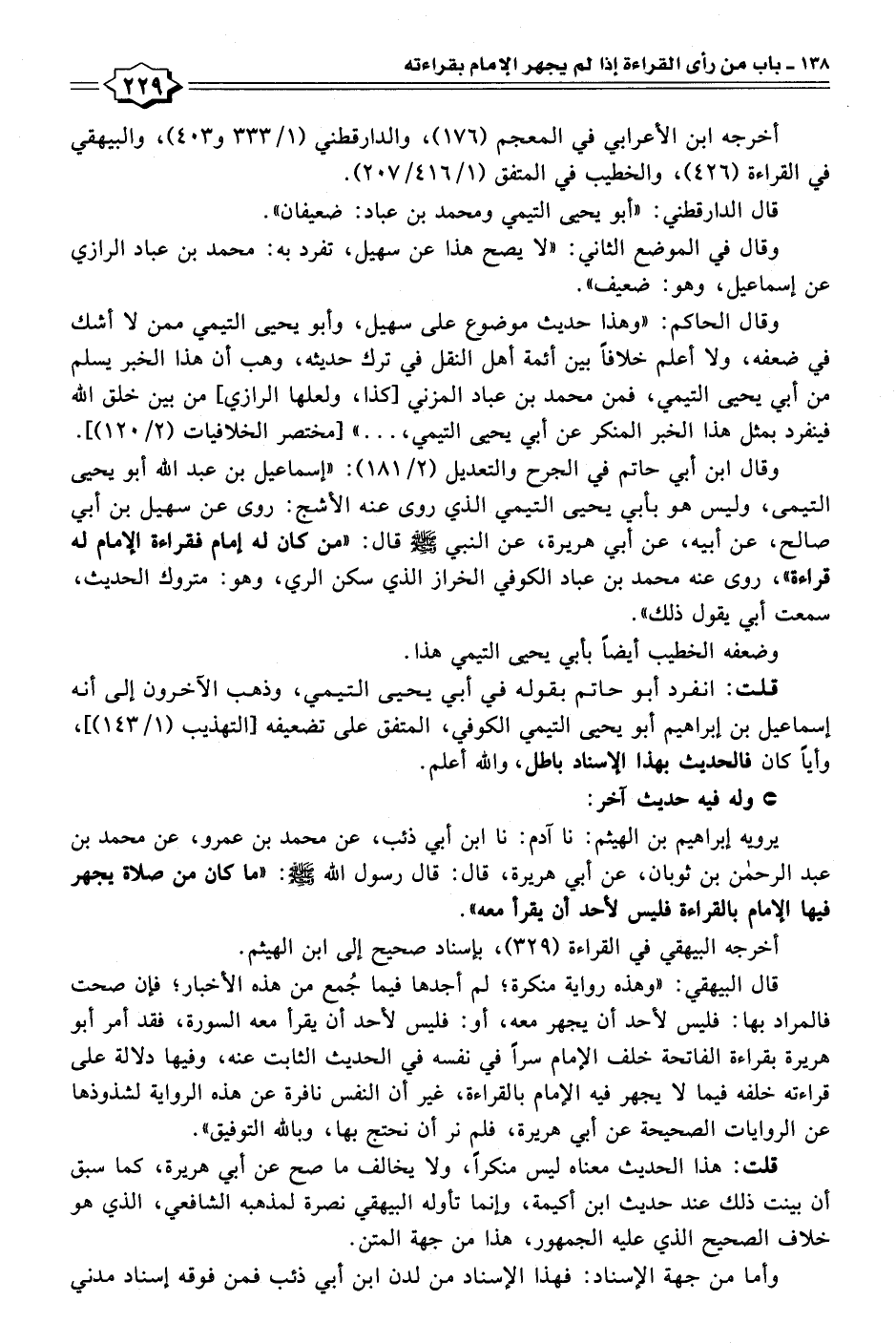 وقال ابن أبي حاتم في الجرح والتعديل (٢/ ١٨١): "إسماعيل بن عبد الله أبو يحيى التيمى، وليس هو بأبي يحيى التيمي الذي روى عنه الأشج: روى عن سهيل بن أبي صالح، عن أبيه، عن أبي هريرة، عن النبي - صلى الله عليه وسلم - قال: "من كان له إمام فقراءة الإمام له قراءة"، روى عنه محمد بن عباد الكوفي الخراز الذي سكن الري، وهو: متروك الحديث، سمعت أبي يقول ذلك".