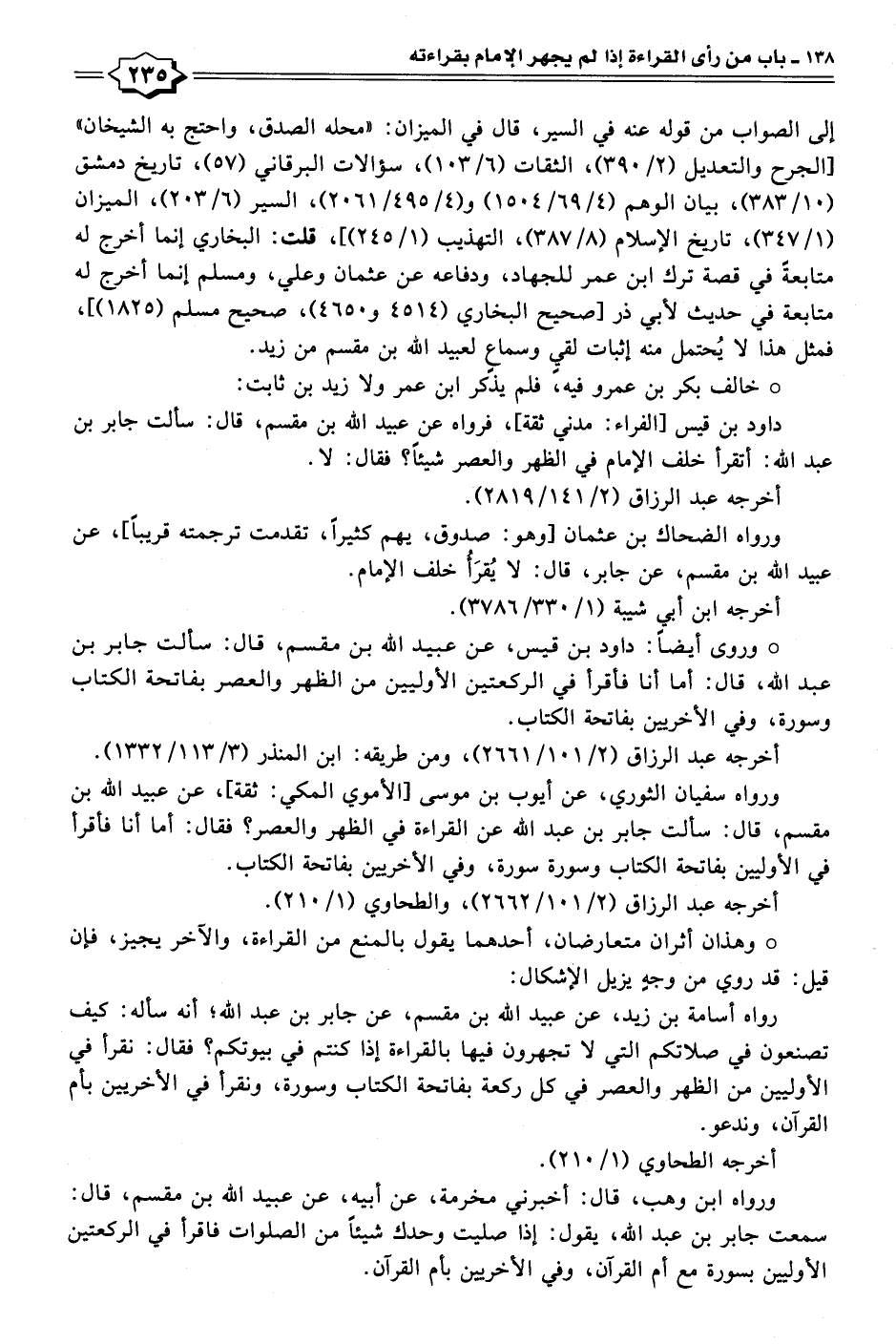• وروى أيضًا: داود بن قيس، عن عبيد الله بن مقسم، قال: سألت جابر بن عبد الله، قال: أما أنا فأقرأ في الركعتين الأوليين من الظهر والعصر بفاتحة الكتاب وسورة، وفي الأخريين بفاتحة الكتاب.