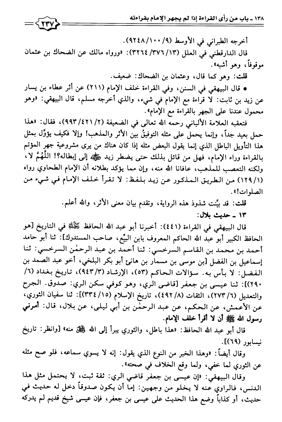 قال البيهقي في القراءة (٤٤١): أخبرنا أبو عبد الله الحافظ رحمه الله في التاريخ [هو الحافظ الكبير أبو عبد الله الحاكم المعروف بابن البيِّع، صاحب المستدرك]: ثنا أبو حامد أحمد بن محمد بن القاسم السرخسي: ثنا أحمد بن عبد الرحمن السرخسي: ثنا إسماعيل بن الفضل [بن موسى بن مسمار بن هانئ أبو بكر البلخي، أخو عبد الصمد بن الفضل: لا بأس به. سؤالات الحاكم (٥٣)، الإرشاد (٣/ ٩٤٣)، تاريخ بغداد (٦/ ٢٩٠)]: ثنا عيسى بن جعفر [قاضي الري، وهو كوفي سكن الري: صدوق. الجرح والتعديل (٦/ ٢٧٣)، الثقات (٨/ ٤٩٢)، تاريخ الإسلام (١٥/ ٣٣٤)]: ثنا سفيان الثوري، عن الأعمش، عن الحكم، عن عبد الرحمن بن أبي ليلى، عن بلال، قال: أمرني رسول الله - صلى الله عليه وسلم - أن لا أقرأ خلف الإمام.