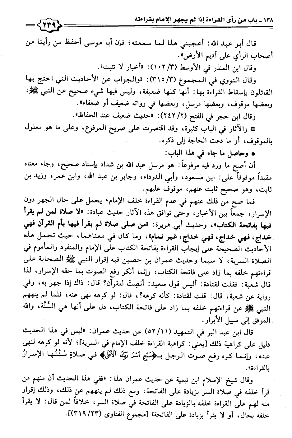 فما صح من ذلك عنهم في عدم القراءة خلف الإمام؛ يحمل على حال الجهر دون الإسرار، جمعًا بين الأخبار، وحتى توافق هذه الآثار حديث عبادة: "لا صلاة لمن لم يقرأ فيها بفاتحة الكتاب"، وحديث أبي هريرة: "من صلى صلاة لم يقرأ فيها بأم القرأن فهي خداج، فهي خداج، فهي خداج، غير تمام"، وما كان في معناهما، حيث تحمل هذه الأحاديث الصحيحة على إيجاب القراءة بفاتحة الكتاب على الإمام والمنفرد والمأموم في الصلاة السرية، لا سيما وحديث عمران بن حصين فيه إقرار النبي - صلى الله عليه وسلم - الصحابة على قراءتهم خلفه بما زاد على فاتحة الكتاب، وإنما أنكر رفع الصوت بما حقه الإسرار، لذا قال شعبة: فقلت لقتادة: أليس قول سعيد: أنصِتْ للقرآن؟ قال: ذاك إذا جهر به، وفي رواية عن شعبة، قال: قلت لقتادة: كأنه كرهه؟، قال: لو كرهه نهى عنه، فلما لم ينههم النبي - صلى الله عليه وسلم - عن قراءتهم خلفه بما زاد على فاتحة الكتاب، دل على أنها هي السُّنَّة، واللّه الموفق إلى سبيل الأبرار.