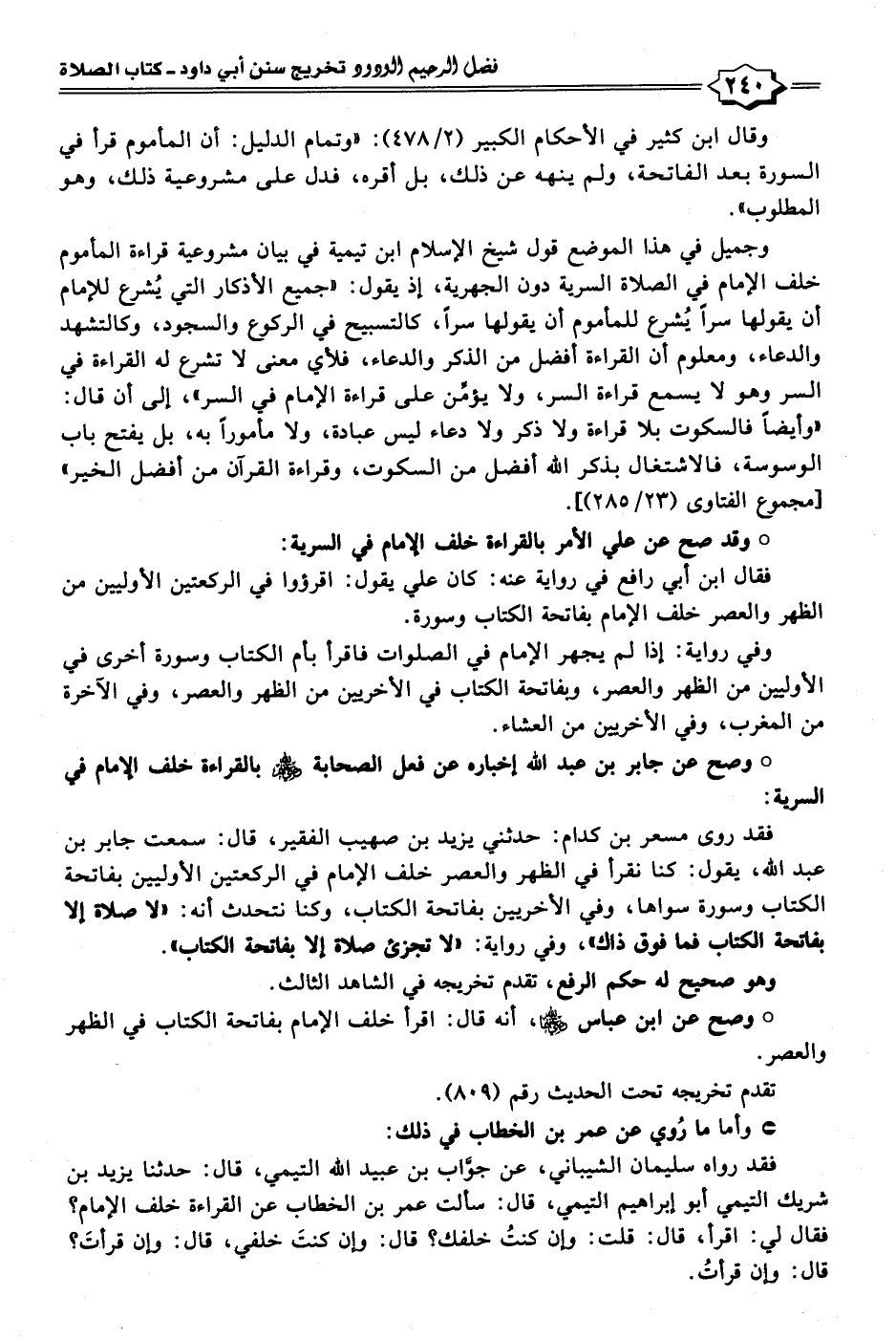 • وصح عن جابر بن عبد الله إخباره عن فعل الصحابة - رضي الله عنهم - بالقراءة خلف الإمام في السرية: