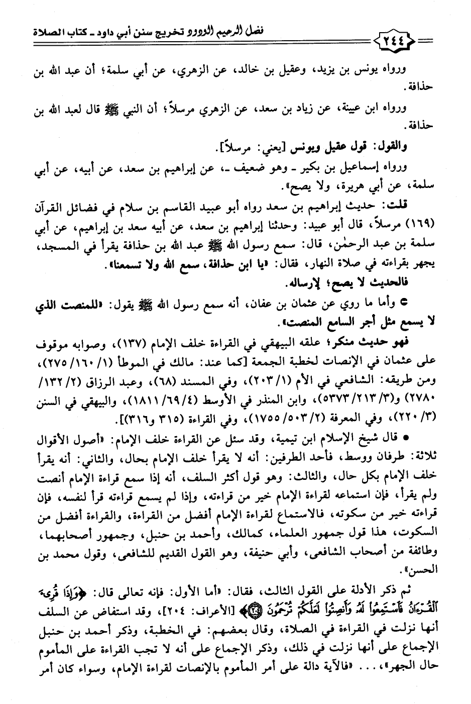 • قال شيخ الإسلام ابن تيمية، وقد سئل عن القراءة خلف الإمام: "أصول الأقوال ثلاثة: طرفان ووسط، فأحد الطرفين: أنه لا يقرأ خلف الإمام بحال، والثاني: أنه يقرأ خلف الإمام بكل حال، والثالث: وهو قول أكثر السلف، أنه إذا سمع قراءة الإمام أنصت ولم يقرأ، فإن استماعه لقراءة الإمام خير من قراءته، وإذا لم يسمع قراءته قرأ لنفسه، فإن قراءته خير من سكوته، فالاستماع لقراءة الإمام أفضل من القراءة، والقراءة أفضل من السكوت، هذا قول جمهور العلماء، كمالك، وأحمد بن حنبل، وجمهور أصحابهما، وطائفة من أصحاب الشافعي، وأبي حنيفة، وهو القول القديم للشافعي، وقول محمد بن الحسن".