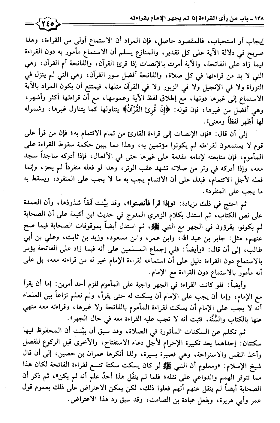 ثم احتج في ذلك بزيادة: "وإذا قرأ فأنصتوا"، وقد بيَّنت آنفًا شذوذها، وأن العمدة على نص الكتاب، ثم استدل بكلام الزهري المدرج في حديث ابن أكيمة على أن الصحابة لم يكونوا يقرؤون في الجهر مع النبي - صلى الله عليه وسلم -، ثم استدل أيضًا بموقوفات الصحابة فيما صح عنهم، مثل: جابر بن عبد الله، وابن عمر، وابن مسعود، وزيد بن ثابت، وعلي بن أبي طالب، إلى أن قال: "وأيضًا: ففي إجماع المسلمين على أنه فيما زاد على الفاتحة يؤمر بالاستماع دون القراءة دليل على أن استماعه لقراءة الإمام خير له من قراءته معه، بل على أنه مأمور بالاستماع دون القراءة مع الإمام.
