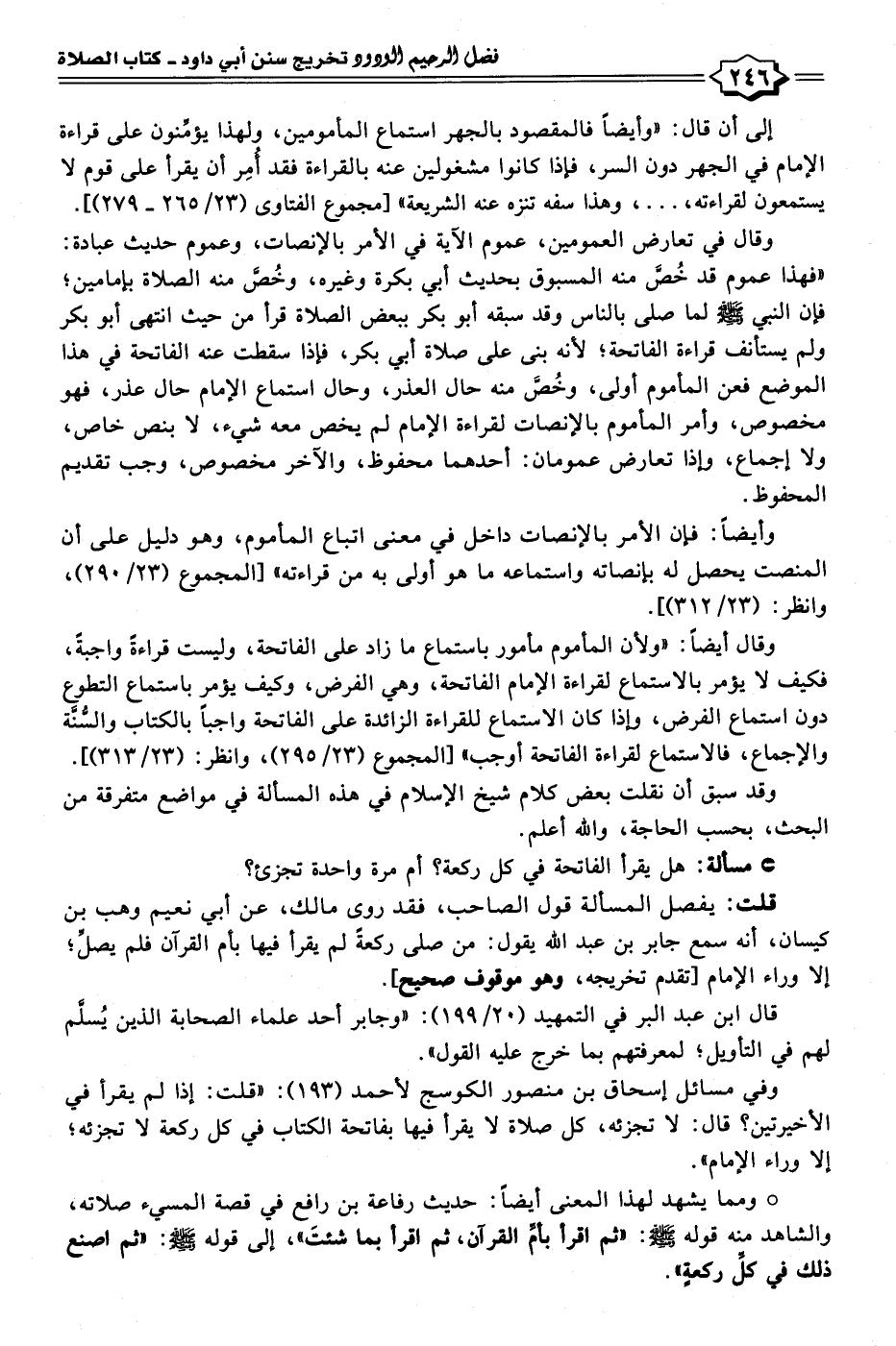وقال أيضًا: "ولأن المأموم مأمور باستماع ما زاد على الفاتحة، وليست قراءةً واجبةً، فكيف لا يؤمر بالاستماع لقراءة الإمام الفاتحة، وهي الفرض، وكيف يؤمر باستماع التطوع دون استماع الفرض، وإذا كان الاستماع للقراءة الزائدة على الفاتحة واجبًا بالكتاب والسُّنَّة والإجماع، فالاستماع لقراءة الفاتحة أوجب" [المجموع (٢٣/ ٢٩٥)، وانظر: (٢٣/ ٣١٣)].