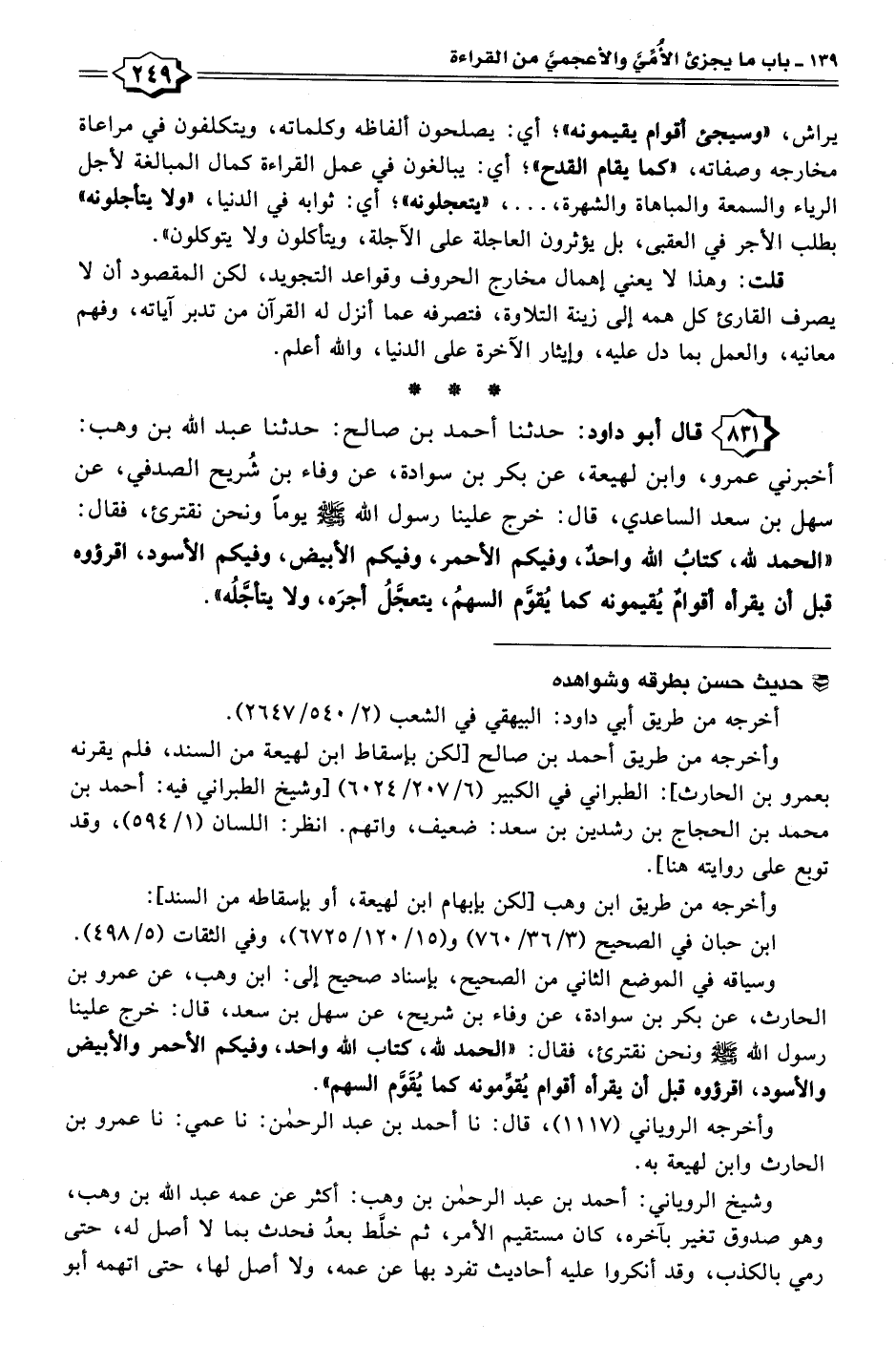 ٨٣١ - . . . قال أبو داود: حدثنا أحمد بن صالح: حدثنا عبد الله بن وهب: أخبرني عمرو، وابن لهيعة، عن بكر بن سوادة، عن وفاء بن شُريح الصدفي، عن سهل بن سعد الساعدي، قال: خرج علينا رسول الله - صلى الله عليه وسلم - يومًا ونحن نقترئ، فقال: "الحمد لله، كتابُ الله واحدٌ، وفيكم الأحمر، وفيكم الأبيض، وفيكم الأسود، اقرؤوه قبل أن يقرأه أقوامٌ يُقيمونه كما يُقوَّم السهمُ، يتعجَّلُ أجرَه، ولا يتأجَّلُه".