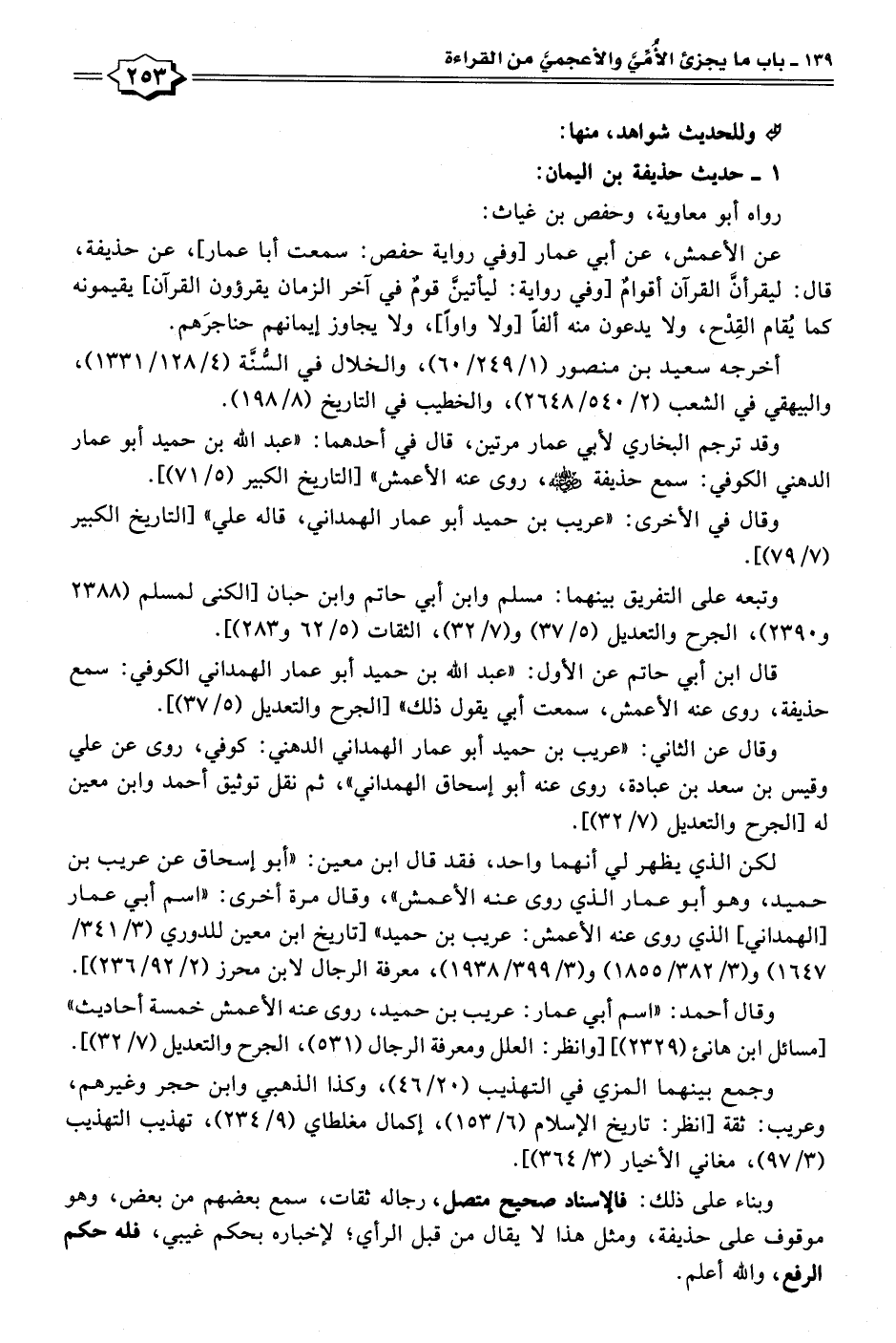 عن الأعمش، عن أبي عمار [وفي رواية حفص: سمعت أبا عمار]، عن حذيفة، قال: ليقرأنَّ القرآن أقوامٌ [وفي رواية: ليأتينَّ قومٌ في آخر الزمان يقرؤون القرآن] يقيمونه كما يُقام القِدْح، ولا يدعون منه ألفًا [ولا واوًا]، ولا يجاوز إيمانهم حناجرَهم.