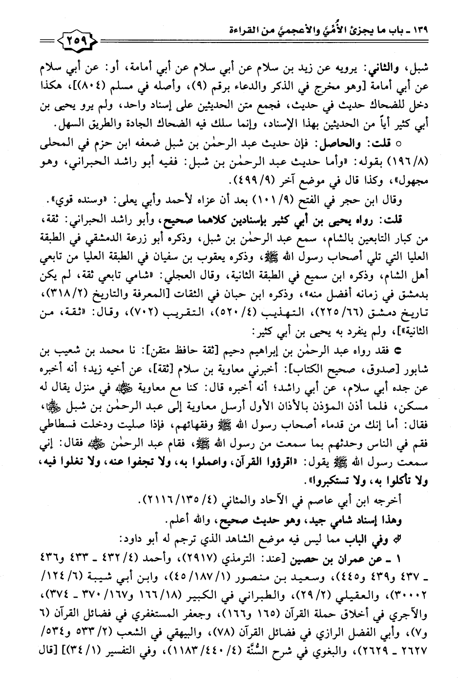 • فقد رواه عبد الرحمن بن إبراهيم دحيم [ثقة حافظ متقن]: نا محمد بن شعيب بن شابور [صدوق، صحيح الكتاب]: أخبرني معاوية بن سلام [ثقة]، عن أخيه زيد؛ أنه أخبره عن جده أبي سلام، عن أبي راشد؛ أنه أخبره قال: كنا مع معاوية - رضي الله عنه - في منزل يقال له مسكن، فلما أذن المؤذن بالأذان الأول أرسل معاوية إلى عبد الرحمن بن شبل - رضي الله عنهما -، فقال: أما إنك من قدماء أصحاب رسول الله - صلى الله عليه وسلم - وفقهائهم، فإذا صليت ودخلت فسطاطي فقم في الناس وحدثهم بما سمعت من رسول الله - صلى الله عليه وسلم -، فقام عبد الرحمن - رضي الله عنه - فقال: إني سمعت رسول الله - صلى الله عليه وسلم - يقول: "اقرؤوا القرآن، واعملوا به، ولا تجفوا عنه، ولا تغلوا فيه، ولا تأكلوا به، ولا تستكبروا".