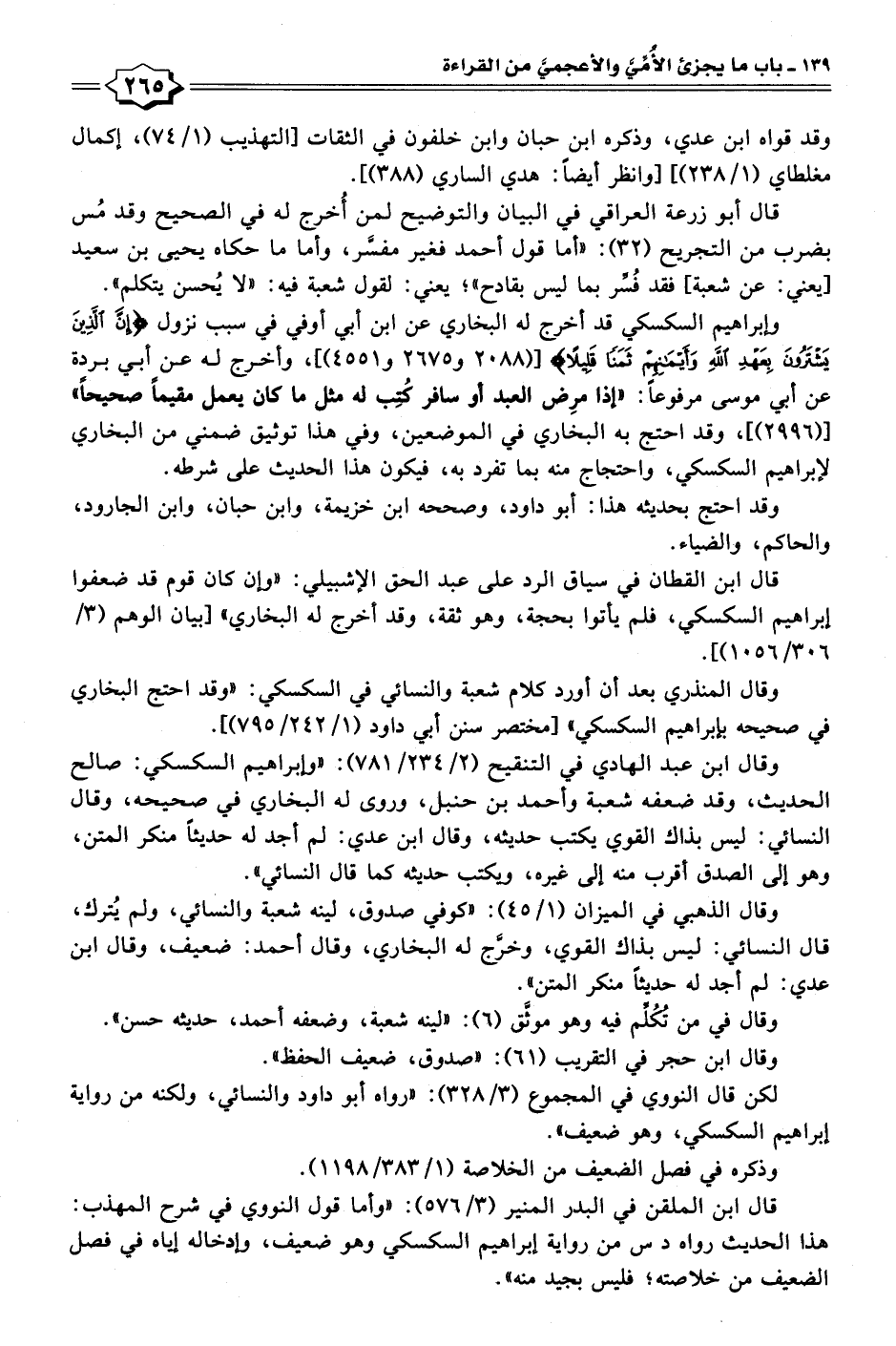 وقال ابن عبد الهادي في التنقيح (٢/ ٢٣٤/ ٧٨١): "وإبراهيم السكسكي: صالح الحديث، وقد ضعفه شعبة وأحمد بن حنبل، وروى له البخاري في صحيحه، وقال النسائي: ليس بذاك القوي يكتب حديثه، وقال ابن عدي: لم أجد له حديثًا منكر المتن، وهو إلى الصدق أقرب منه إلى غيره، ويكتب حديثه كما قال النسائي".