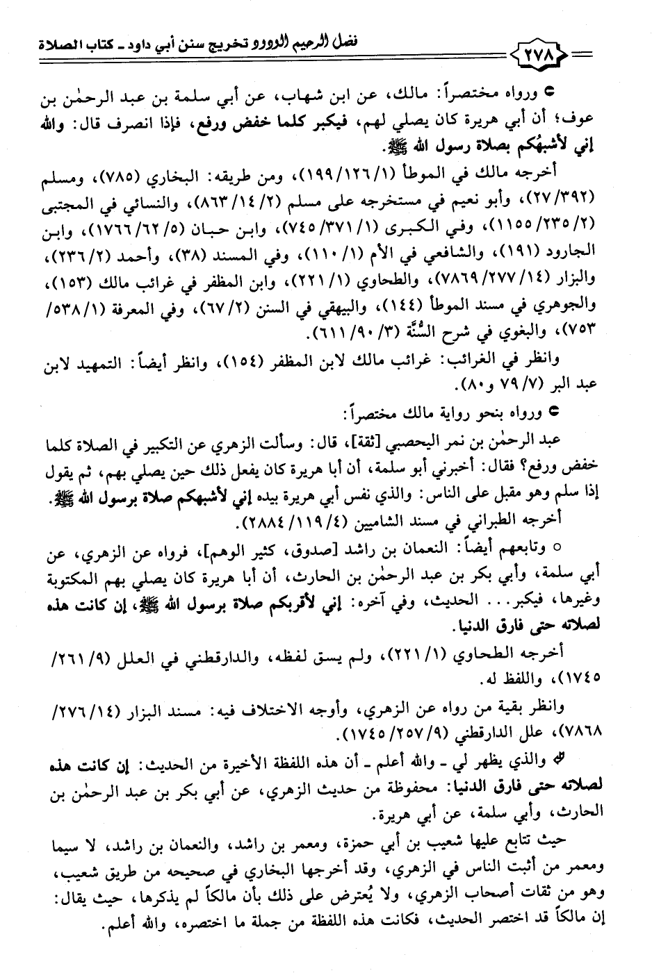 عبد الرحمن بن نمر اليحصبي [ثقة]، قال: وسألت الزهري عن التكبير في الصلاة كلما خفض ورفع؟ فقال: أخبرني أبو سلمة، أن أبا هريرة كان يفعل ذلك حين يصلي بهم، ثم يقول إذا سلم وهو مقبل على الناس: والذي نفس أبي هريرة بيده إني لأشبهكم صلاة برسول الله - صلى الله عليه وسلم -.