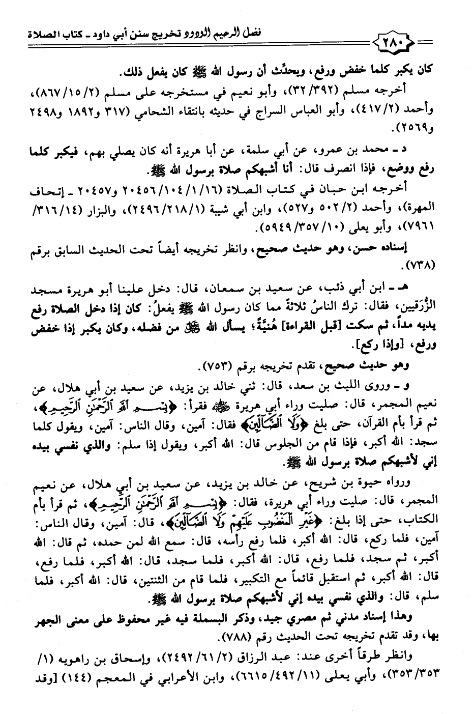 و- وروى الليث بن سعد، قال: ثني خالد بن يزيد، عن سعيد بن أبي هلال، عن نعيم المجمر، قال: صليت وراء أبي هريرة - رضي الله عنه - فقرأ: {بِسْمِ اللَّهِ الرَّحْمَنِ الرَّحِيمِ}، ثم قرأ بأم القرآن، حتى بلغ {وَلَا الضَّالِّينَ}، فقال: آمين، وقال الناس: آمين، ويقول كلما سجد: الله أكبر، فإذا قام من الجلوس قال: الله أكبر، ويقول إذا سلم: والذي نفسي بيده إني لأشبهكم صلاة برسول لله - صلى الله عليه وسلم -.
