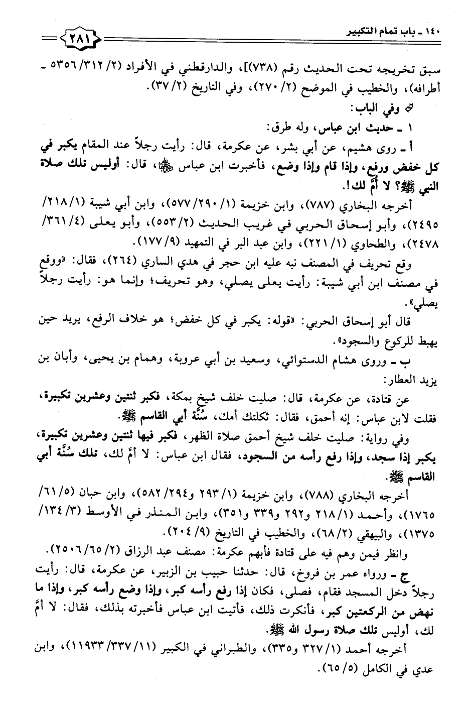 ج- ورواه عمر بن فروخ، قال: حدثنا حبيب بن الزبير، عن عكرمة، قال: رأيت رجلًا دخل المسجد فقام، فصلى، فكان إذا رفع رأسه كبر، وإذا وضع رأسه كبر، وإذا ما نهض من الركعتين كبر، فأنكرت ذلك، فأتيت ابن عباس فأخبرته بذلك، فقال: لا أمَّ لك، أوليس تلك صلاة رسول الله - صلى الله عليه وسلم -.