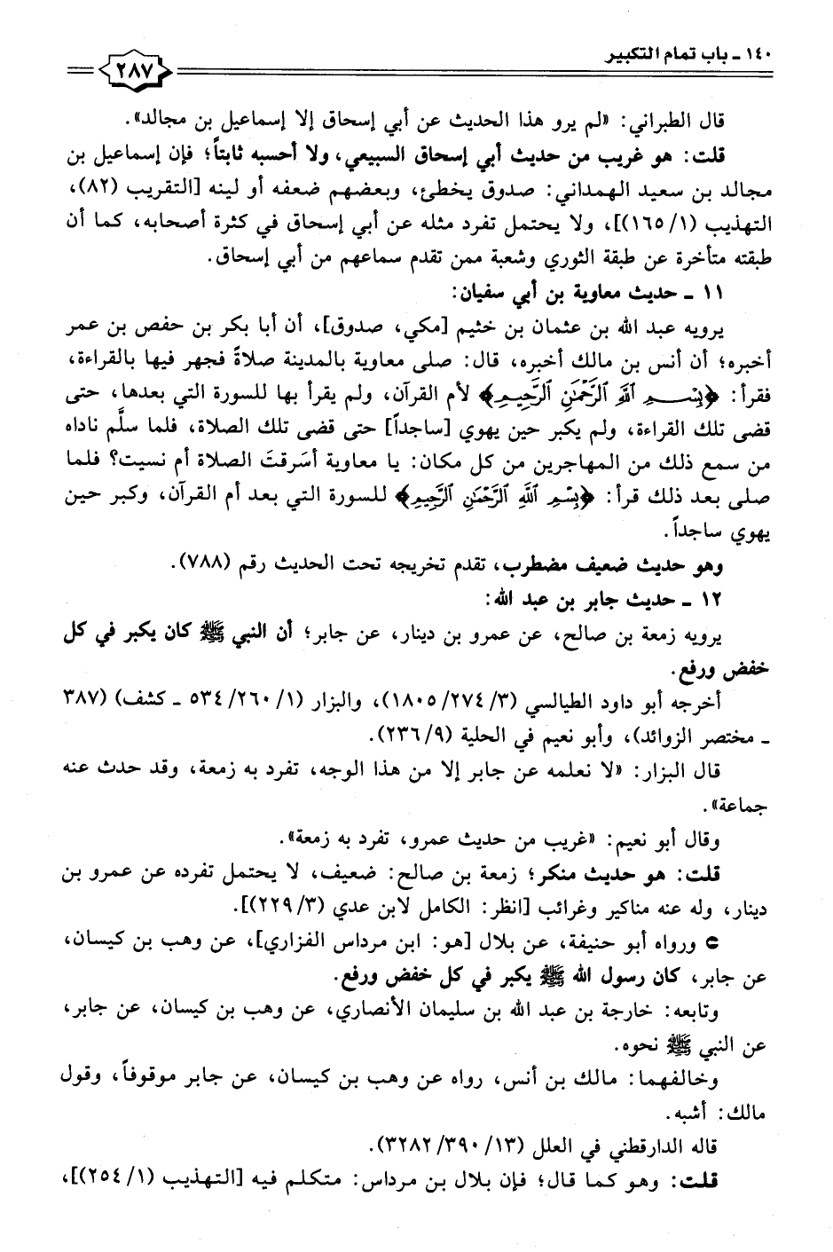 يرويه عبد الله بن عثمان بن خثيم [مكي، صدوق]، أن أبا بكر بن حفص بن عمر أخبره؛ أن أنس بن مالك أخبره، قال: صلى معاوية بالمدينة صلاةً فجهر فيها بالقراءة، فقرأ: {بِسْمِ اللَّهِ الرَّحْمَنِ الرَّحِيمِ} لأم القرآن، ولم يقرأ بها للسورة التي بعدها، حتى قضى تلك القراءة، ولم يكبر حين يهوي [ساجدًا] حتى قضى تلك الصلاة، فلما سلَّم ناداه من سمع ذلك من المهاجرين من كل مكان: يا معاوية أسَرقتَ الصلاة أم نسيت؟ فلما صلى بعد ذلك قرأ: {بِسْمِ اللَّهِ الرَّحْمَنِ الرَّحِيمِ} للسورة التي بعد أم القرآن، وكبر حين يهوي ساجدًا.