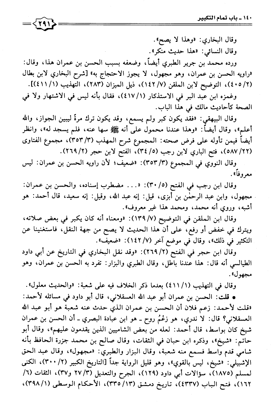 وقال ابن الملقن في التوضيح (٧/ ١٣٩): "ومعناه أنه كان يكبر في بعض صلاته، ويترك في خفض أو رفع، على أن هذا الحديث لا يصح من جهة النقل، فاستغنينا عن التكثير في ذلك"، وقال في موضع آخر (٧/ ١٤٢): "ضعيف".