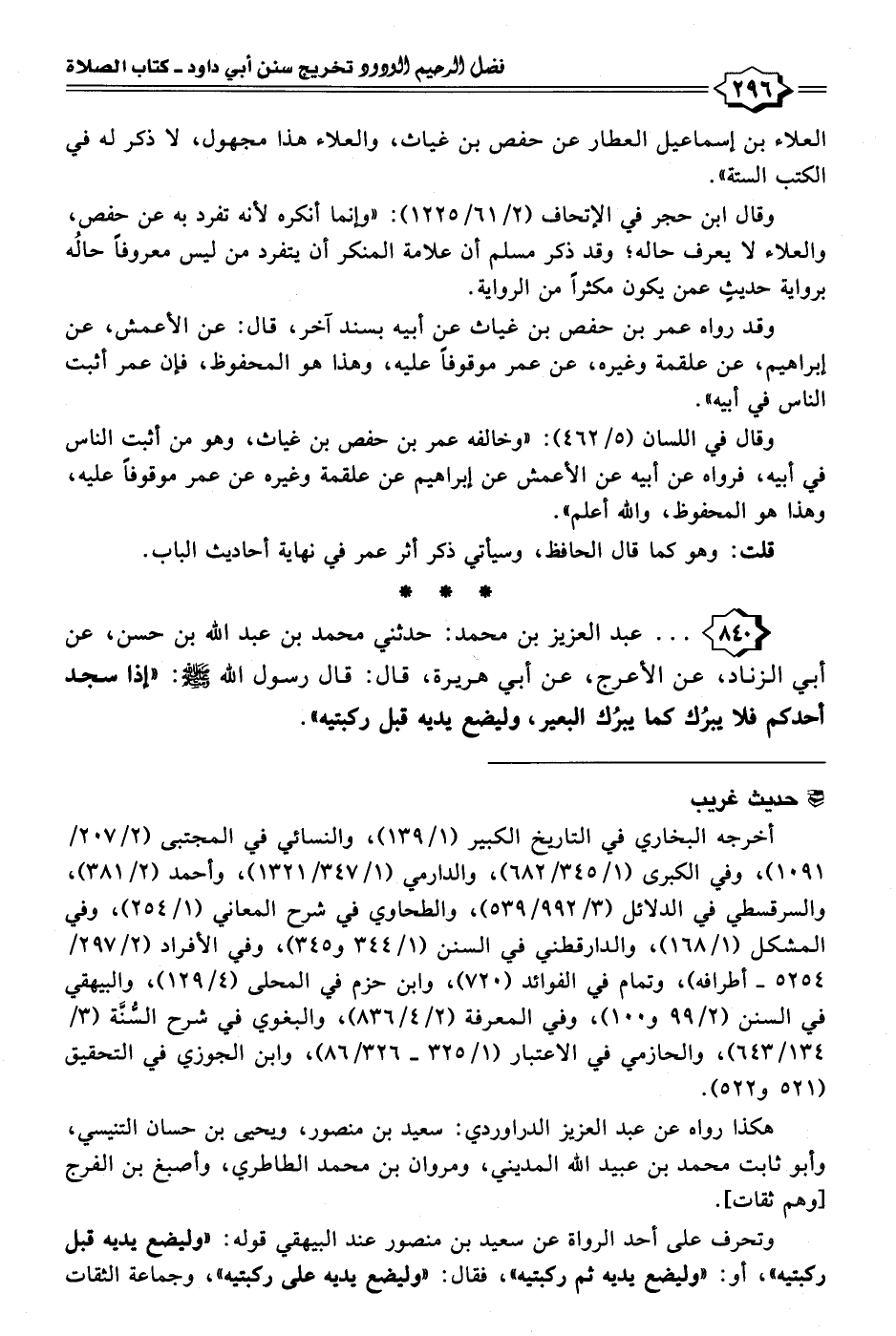 وتحرف على أحد الرواة عن سعيد بن منصور عند البيهقي قوله: "وليضع يديه قبل ركبتيه"، أو: "وليضع يديه ثم ركبتيه"، فقال: "وليضع يديه على ركبتيه"، وجماعة الثقات