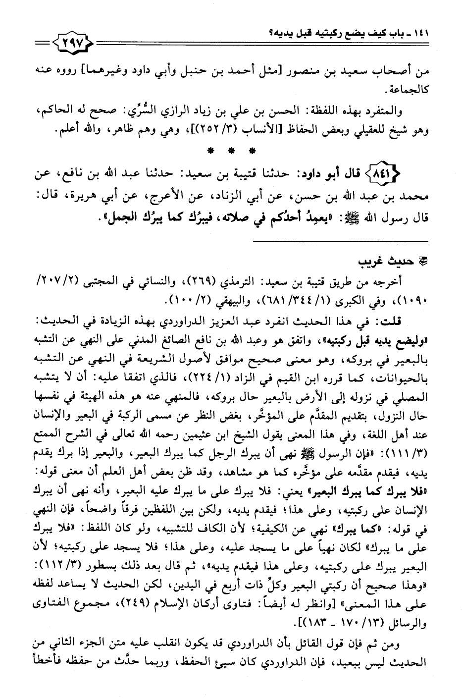 قلت: في هذا الحديث انفرد عبد العزيز الدراوردي بهذه الزيادة في الحديث: "وليضع يديه قبل ركبتيه"، واتفق هو وعبد الله بن نافع الصائغ المدني على النهي عن التشبه بالبعير في بروكه، وهو معنى صحيح موافق لأصول الشريعة في النهي عن التشبه بالحيوانات، كما قرره ابن القيم في الزاد (١/ ٢٢٤)، فالذي اتفقا عليه: أن لا يتشبه المصلي في نزوله إلى الأرض بالبعير حال بروكه، فالمنهي عنه هو هذه الهيئة في نفسها حال النزول، بتقديم المقدَّم على المؤخَّر، بغض النظر عن مسمى الركبة في البعير والإنسان عند أهل اللغة، وفي هذا المعنى يقول الشيخ ابن عثيمين رحمه الله تعالى في الشرح الممتع (٣/ ١١١): "فإن الرسول - صلى الله عليه وسلم - نهى أن يبرك الرجل كما يبرك البعير، والبعير إذا برك يقدم يديه، فيقدم مقدَّمه على مؤخَّره كما هو مشاهد، وقد ظن بعض أهل العلم أن معنى قوله: "فلا يبرك كما يبرك البعير" يعني: فلا يبرك على ما يبرك عليه البعير، وأنه نهى أن يبرك الإنسان على ركبتيه، وعلى هذا؛ فيقدم يديه، ولكن بين اللفظين فرقًا واضحًا، فإن النهي في قوله: "كما يبرك" نهي عن الكيفية؛ لأن الكاف للتشبيه، ولو كان اللفظ: "فلا يبرك على ما يبرك" لكان نهيًا على ما يسجد عليه، وعلى هذا؛ فلا يسجد على ركبتيه؛ لأن البعير يبرك على ركبتيه، وعلى هذا فيقدم يديه"، ثم قال بعد ذلك بسطور (٣/ ١١٢): "وهذا صحيح أن ركبتي البعير وكلِّ ذات أربع في اليدين، لكن الحديث لا يساعد لفظه على هذا المعنى" [وانظر له أيضًا: فتاوى أركان الإسلام (٢٤٩)، مجموع الفتاوى والرسائل (١٣/ ١٧٠ - ١٨٣)].