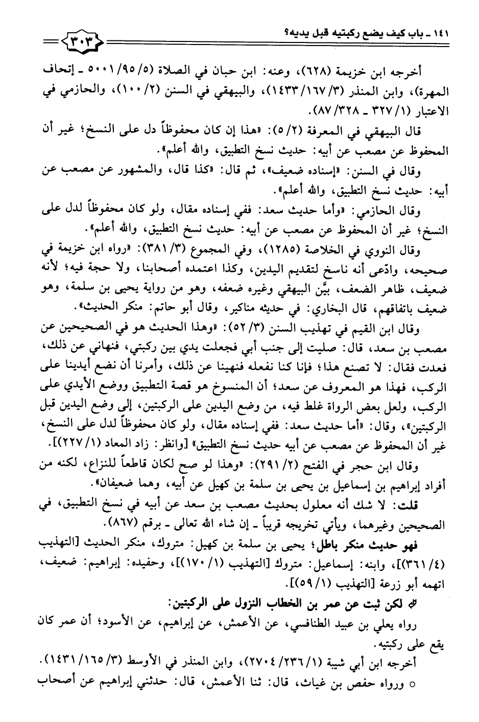 وقال ابن القيم في تهذيب السنن (٣/ ٥٢): "وهذا الحديث هو في الصحيحين عن مصعب بن سعد، قال: صليت إلى جنب أبي فجعلت يدي بين ركبتي، فنهاني عن ذلك، فعدت فقال: لا تصنع هذا؛ فإنا كنا نفعله فنهينا عن ذلك، وأمرنا أن نضع أيدينا على الركب، فهذا هو المعروف عن سعد؛ أن المنسوخ هو قصة التطبيق ووضع الأيدي على الركب، ولعل بعض الرواة غلط فيه، من وضع اليدين على الركبتين، إلى وضع اليدين قبل الركبتين"، وقال: "أما حديث سعد: ففي إسناده مقال، ولو كان محفوظًا لدل على النسخ، غير أن المحفوظ عن مصعب عن أبيه حديث نسخ التطبيق" [وانظر: زاد المعاد (١/ ٢٢٧)].