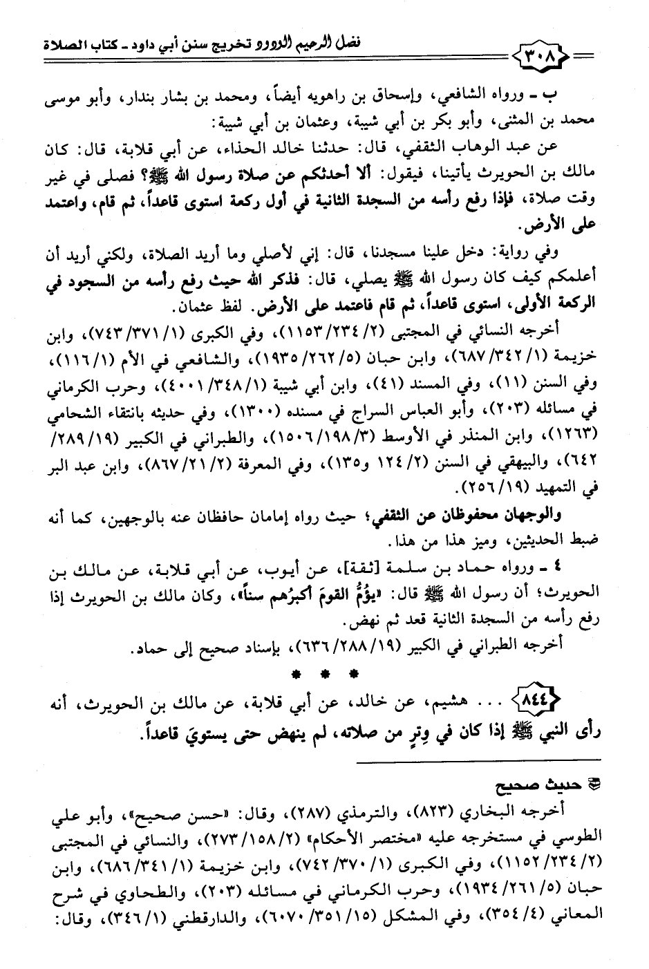 ٨٤٤ - . . . هشيم، عن خالد، عن أبي قلابة، عن مالك بن الحويرث، أنَّه رأى النبي - صلى الله عليه وسلم - إذا كان في وِترٍ من صلاته، لم ينهض حتى يستويَ قاعدًا.