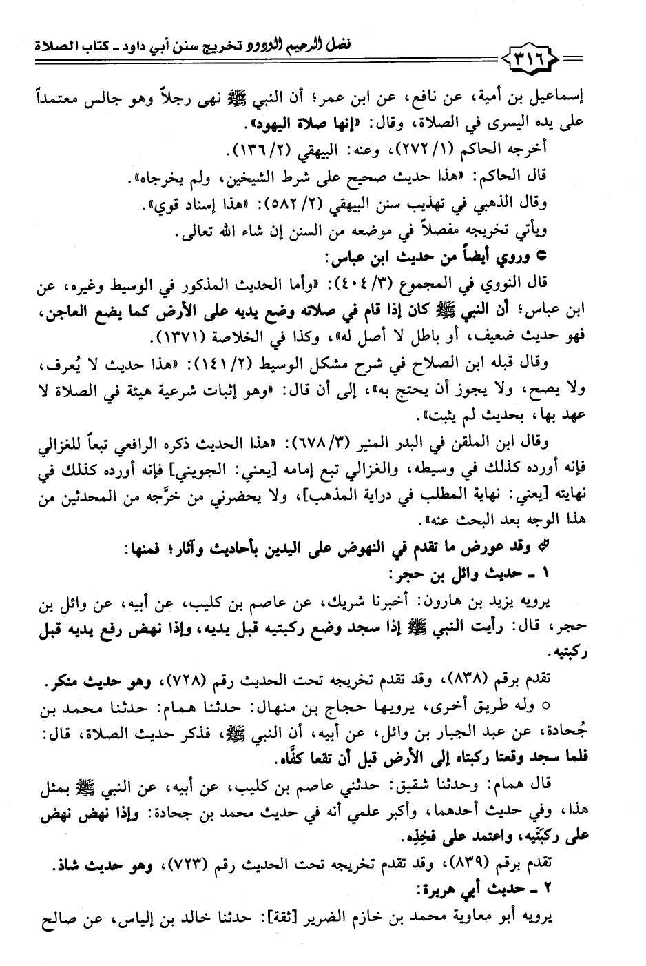 • وله طريق أخرى، يرويها حجاج بن منهال: حدثنا همام: حدثنا محمَّد بن جُحادة، عن عبد الجبار بن وائل، عن أبيه، أن النبي - صلى الله عليه وسلم -، فذكر حديث الصلاة، قال: فلما سجد وقعتا ركبتاه إلى الأرض قبل أن تقعا كفَّاه.