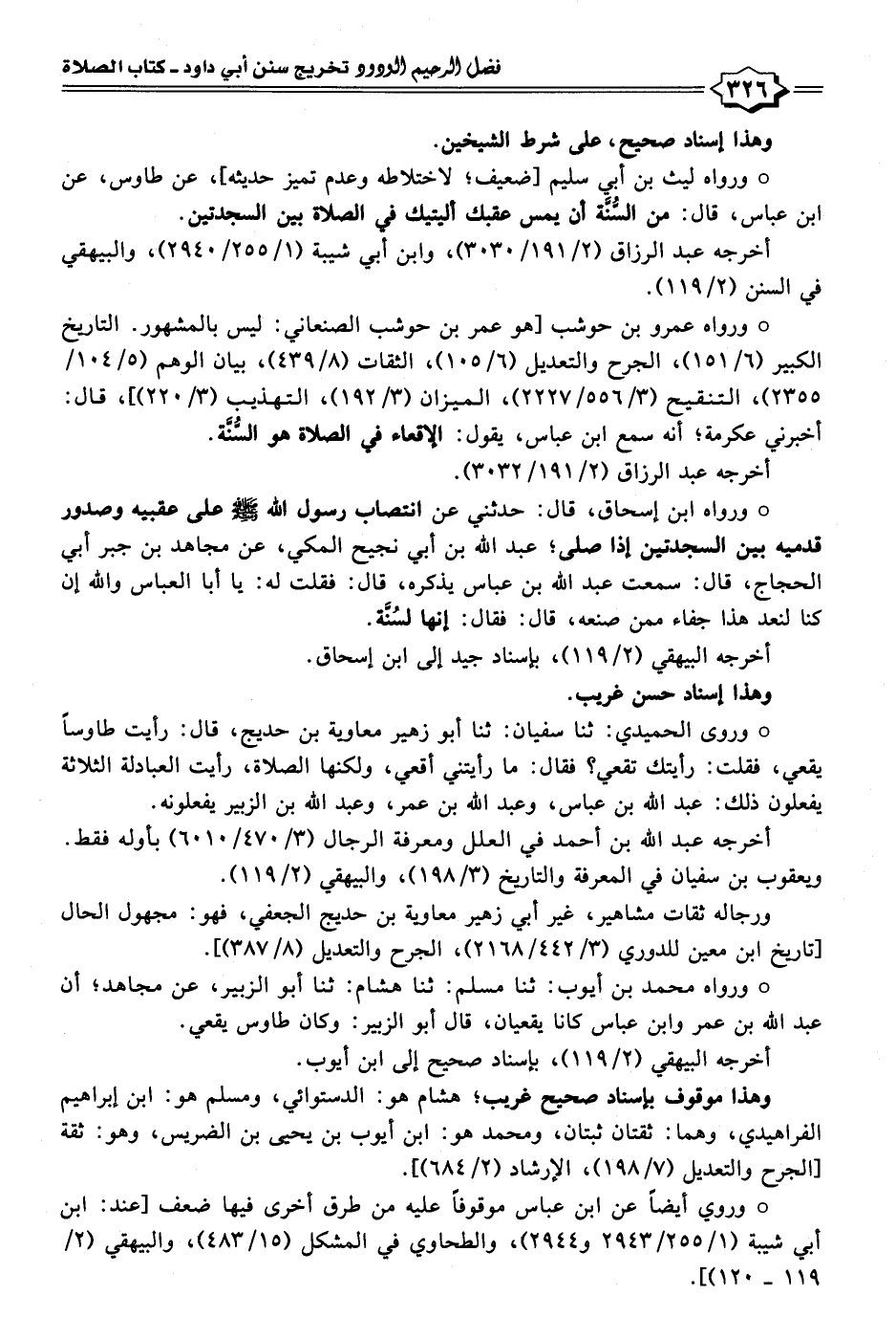• ورواه ليث بن أبي سليم [ضعيف؛ لاختلاطه وعدم تميز حديثه]، عن طاوس، عن ابن عباس، قال: من السُّنَّة أن يمس عقبك أليتيك في الصلاة بين السجدتين.