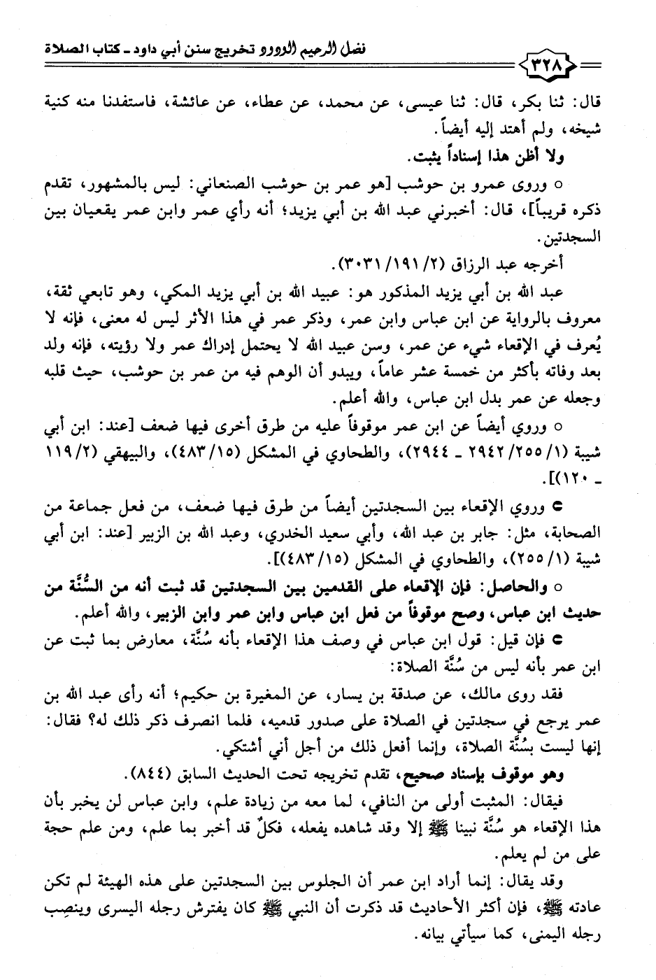 • والحاصل: فإن الإقعاء على القدمين بين السجدتين قد ثبت أنَّه من السُّنَّة من حديث ابن عباس، وصح موقوفًا من فعل ابن عباس وابن عمر وابن الزبير، والله أعلم.