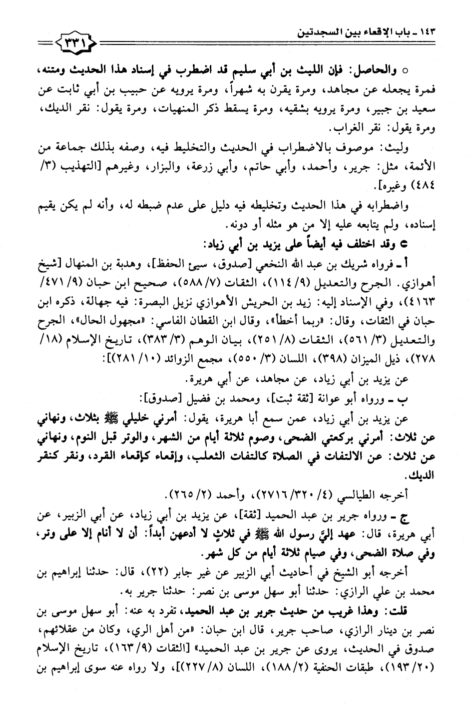 • والحاصل: فإن الليث بن أبي سليم قد اضطرب في إسناد هذا الحديث ومتنه، فمرة يجعله عن مجاهد، ومرة يقرن به شهرًا، ومرة يرويه عن حبيب بن أبي ثابت عن سعيد بن جبير، ومرة يرويه بشقيه، ومرة يسقط ذكر المنهيات، ومرة يقول: نقر الديك، ومرة يقول: نقر الغراب.