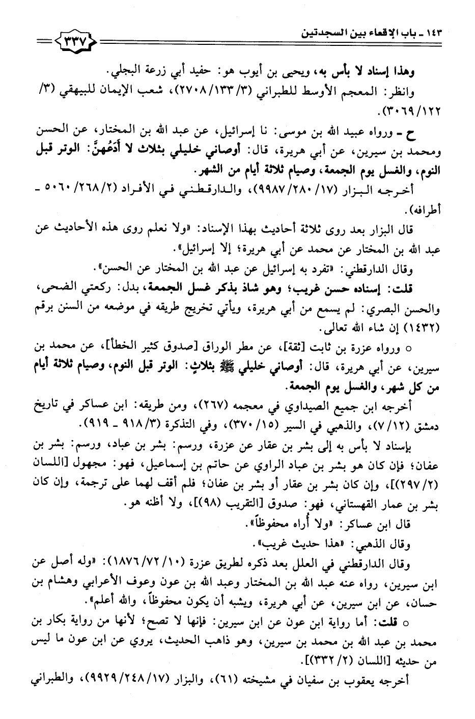 • ورواه عزرة بن ثابت [ثقة]، عن مطر الوراق [صدوق كثير الخطأ]، عن محمَّد بن سيرين، عن أبي هريرة، قال: أوصاني خليلي - صلى الله عليه وسلم - بثلاثٍ: الوتر قبل النوم، وصيام ثلاثة أيام من كل شهر، والغسل يوم الجمعة.