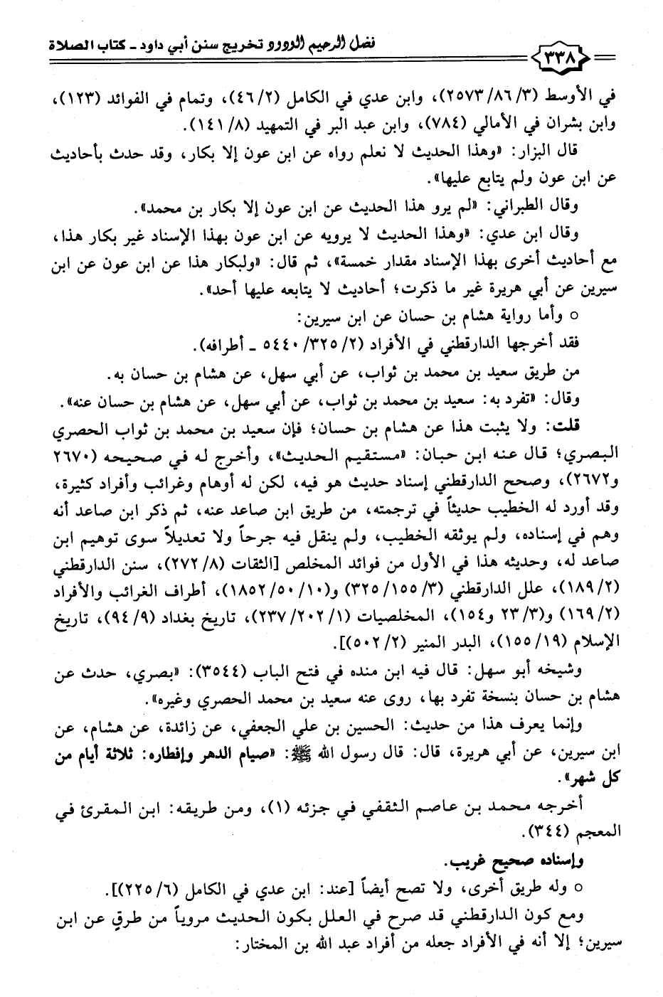 قلت: ولا يثبت هذا عن هشام بن حسان؛ فإن سعيد بن محمَّد بن ثواب الحصري البصري؛ قال عنه ابن حبَّان: "مستقيم الحديث"، وأخرج له في صحيحه (٢٦٧٠ و ٢٦٧٢)، وصحح الدارقطني إسناد حديث هو فيه، لكن له أوهام وغرائب وأفراد كثيرة، وقد أورد له الخطيب حديثًا في ترجمته، من طريق ابن صاعد عنه، ثمَّ ذكر ابن صاعد أنَّه وهم في إسناده، ولم يوثقه الخطيب، ولم ينقل فيه جرحًا ولا تعديلًا سوى توهيم ابن صاعد له، وحديثه هذا في الأوّل من فوائد المخلص [الثقات (٨/ ٢٧٢)، سنن الدارقطني (٢/ ١٨٩)، علل الدارقطني (٣/ ١٥٥/ ٣٢٥) و (١٠/ ٥٠/ ١٨٥٢)، أطراف الغرائب والأفراد (٢/ ١٦٩) و (٣/ ٢٣ و ١٥٤)، المخلصيات (١/ ٢٠٢/ ٢٣٧)، تاريخ بغداد (٩/ ٩٤)، تاريخ الإِسلام (١٩/ ١٥٥)، البدر المنير (٢/ ٥٠٢)].