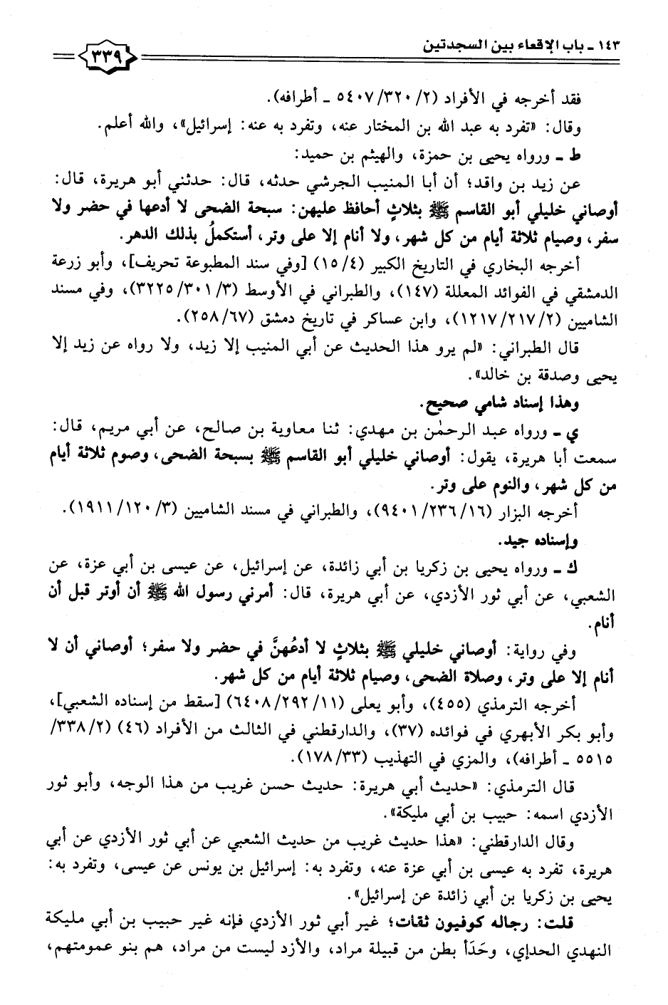 عن زيد بن واقد؛ أن أبا المنيب الجرشي حدثه، قال: حدثني أبو هريرة، قال: أوصاني خليلي أبو القاسم - صلى الله عليه وسلم - بثلاثٍ أحافظ عليهن: سبحة الضحى لا أدعها في حضر ولا سفر، وصيام ثلاثة أيام من كل شهر، ولا أنام إلا على وتر، أستكملُ بذلك الدهر.