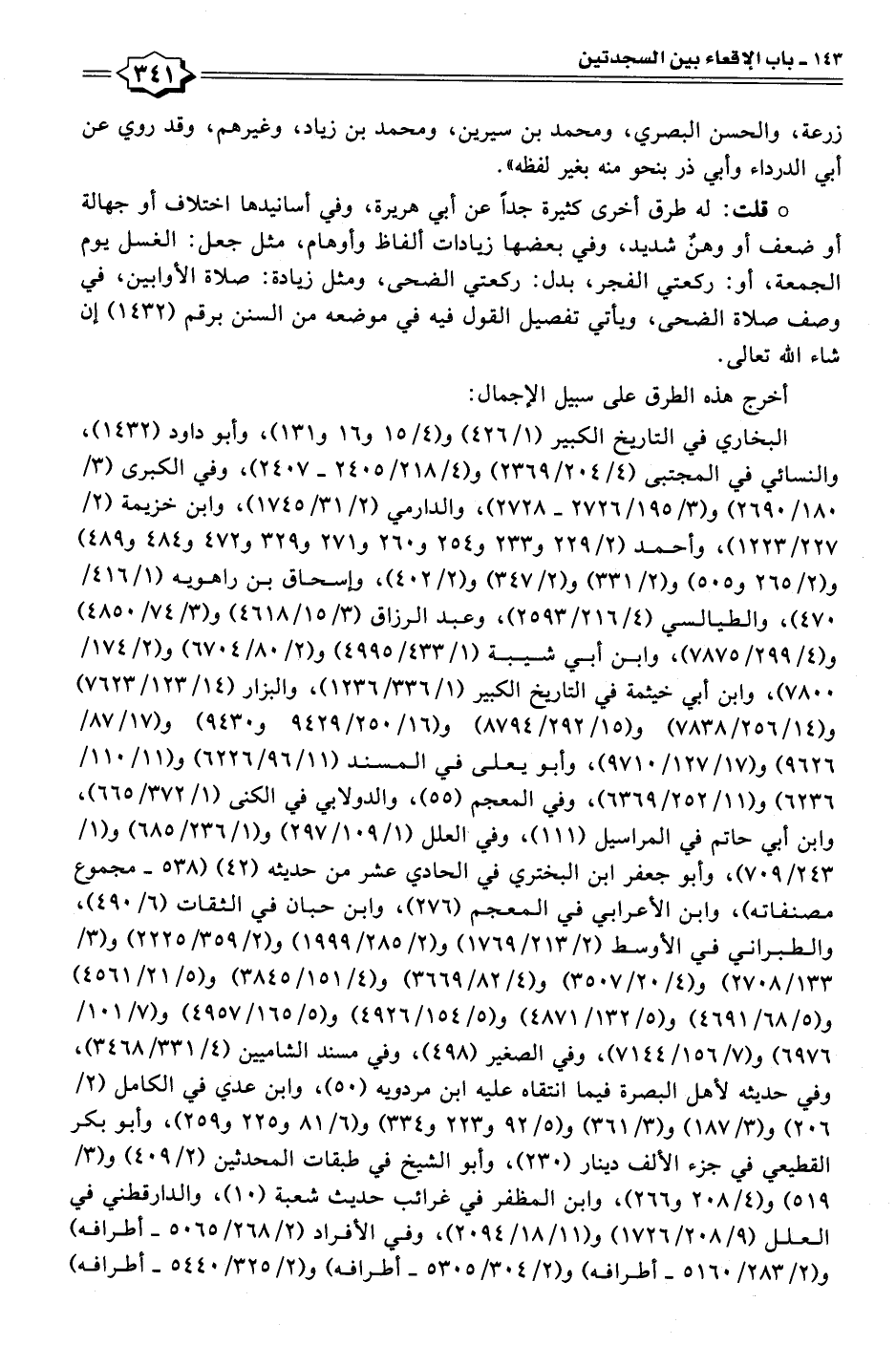البخاري في التاريخ الكبير (١/ ٤٢٦) و (٤/ ١٥ و ١٦ و ١٣١)، وأبو داود (١٤٣٢)، والنسائيُّ في المجتبى (٤/ ٢٠٤/ ٢٣٦٩) و (٤/ ٢١٨/ ٢٤٠٥ - ٢٤٠٧)، وفي الكبرى (٣/ ١٨٠/ ٢٦٩٠) و (٣/ ١٩٥/ ٢٧٢٦ - ٢٧٢٨)، والدارميُّ (٢/ ٣١/ ١٧٤٥)، وابن خزيمة (٢/ ٢٢٧/ ١٢٢٣)، وأحمد (٢/ ٢٢٩ و ٢٣٣ و ٢٥٤ و ٢٦٠ و ٢٧١ و ٣٢٩ و ٤٧٢ و ٤٨٤ و ٤٨٩) و (٢/ ٢٦٥ و ٥٠٥) و (٢/ ٣٣١) و (٢/ ٣٤٧) و (٢/ ٤٠٢)، وإسحاق بن راهويه (١/ ٤١٦/ ٤٧٠)، والطيالسي (٤/ ٢١٦/ ٢٥٩٣)، وعبد الرزاق (٣/ ١٥/ ٤٦١٨) و (٣/ ٧٤/ ٤٨٥٠) و (٤/ ٢٩٩/ ٧٨٧٥)، وابن أبي شيبة (١/ ٤٣٣/ ٤٩٩٥) و (٢/ ٨٠/ ٦٧٠٤) و (٢/ ١٧٤/ ٧٨٠٠)، وابن أبي خيثمة في التاريخ الكبير (١/ ٣٣٦/ ١٢٣٦)، والبزار (١٤/ ١٢٣/ ٧٦٢٣) و (١٤/ ٢٥٦/ ٧٨٣٨) و (٥/ ٢٩٢/ ٨٧٩٤) و (١٦/ ٢٥٠/ ٩٤٢٩ و ٩٤٣٠) و (١٧/ ٨٧/ ٩٦٢٦) و (١٧/ ١٢٧/ ٩٧١٠)، وأبو يعلى في المسند (١١/ ٩٦/ ٦٢٢٦) و (١١/ ١١٠/ ٦٢٣٦) و (١١/ ٢٥٢/ ٦٣٦٩)، وفي المعجم (٥٥)، والدولابي في الكنى (١/ ٣٧٢/ ٦٦٥)، وابن أبي حاتم في المراسيل (١١١)، وفي العلل (١/ ١٠٩/ ٢٩٧) و (١/ ٢٣٦/ ٦٨٥) و (١/ ٢٤٣/ ٧٠٩)، وأبو جعفر ابن البختري في الحادي عشر من حديثه (٤٢) (٥٣٨ - مجموع مصنفاته)، وابن الأعرابي في المعجم (٢٧٦)، وابن حبَّان في الثقات (٦/ ٤٩٠)، والطبراني في الأوسط (٢/ ٢١٣/ ١٧٦٩) و (٢/ ٢٨٥/ ١٩٩٩) و (٢/ ٣٥٩/ ٢٢٢٥) و (٣/ ١٣٣/ ٢٧٠٨) و (٤/ ٢٠/ ٣٥٠٧) و (٤/ ٨٢/ ٣٦٦٩) و (٤/ ١٥١/ ٣٨٤٥) و (٥/ ٢١/ ٤٥٦١) و (٥/ ٦٨/ ٤٦٩١) و (٥/ ١٣٢/ ٤٨٧١) و (٥/ ١٥٤/ ٤٩٢٦) و (٥/ ١٦٥/ ٤٩٥٧) و (٧/ ١٠١/ ٦٩٧٦) و (٧/ ١٥٦/ ٧١٤٤)، وفي الصغير (٤٩٨)، وفي مسند الشاميين (٤/ ٣٣١/ ٣٤٦٨)، وفي حديثه لأهل البصرة فيما انتقاه عليه ابن مردويه (٥٠)، وابن عديّ في الكامل (٢/ ٢٠٦) و (٣/ ١٨٧) و (٣/ ٣٦١) و (٥/ ٩٢ و ٢٢٣ و ٣٣٤) و (٦/ ٨١ و ٢٢٥ و ٢٥٩)، وأبو بكر القطيعي في جزء الألف دينار (٢٣٠)، وأبو الشيخ في طبقات المحدثين (٢/ ٤٠٩) و (٣/ ٥١٩) و (٤/ ٢٠٨ و ٢٦٦)، وابن المظفر في غرائب حديث شعبة (١٠)، والدارقطني في العلل (٩/ ٢٠٨/ ١٧٢٦) و (١١/ ١٨/ ٢٠٩٤)، وفي الأفراد (٢/ ٢٦٨/ ٥٠٦٥ - أطرافه) و (٢/ ٢٨٣/ ٥١٦٠ - أطرافه) و (٢/ ٣٠٤/ ٥٣٠٥ - أطرافه) و (٢/ ٣٢٥/ ٥٤٤٠ - أطرافه)
