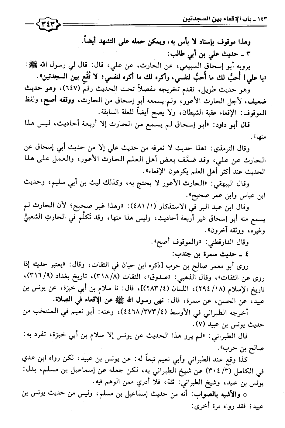 وقال الترمذي: "هذا حديث لا نعرفه من حديث علي إلا من حديث أبي إسحاق عن الحارث عن علي، وقد ضعَّف بعض أهل العلم الحارث الأعور، والعمل على هذا الحديث عند أكثر أهل العلم يكرهون الإقعاء".